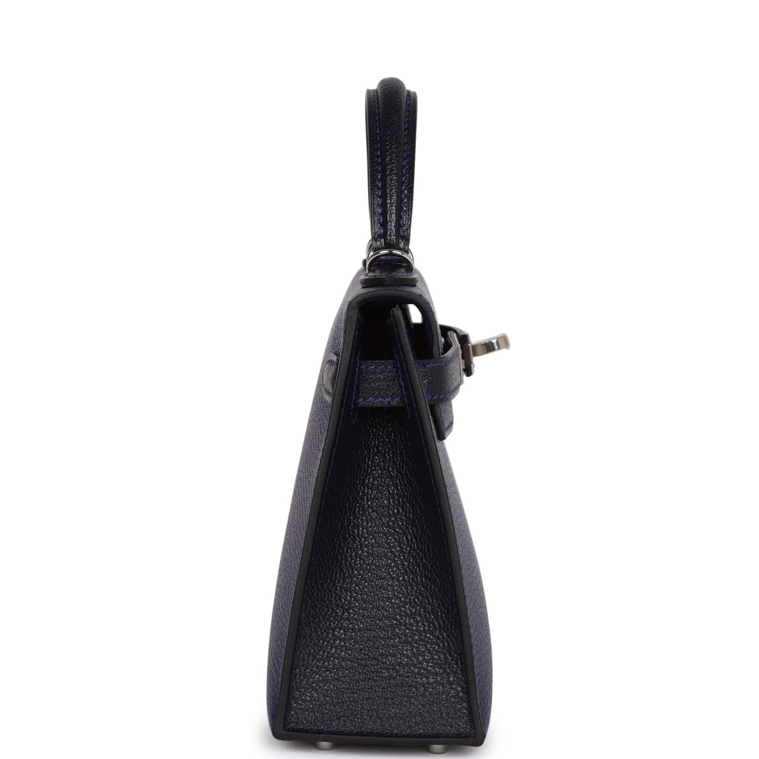 This tiny special order Kelly is in Bleu Encre and Bleu Indigo chevre mysore leather with palladium hardware, has tonal and contrast stitching, two front straps with front toggle closure, single rolled handle and removable shoulder strap.