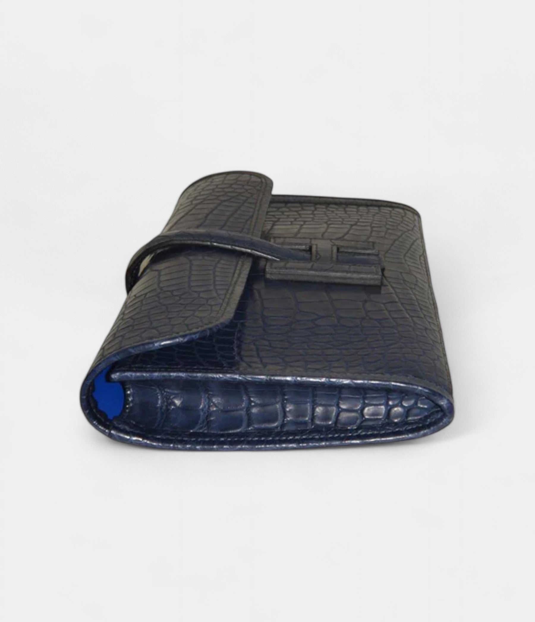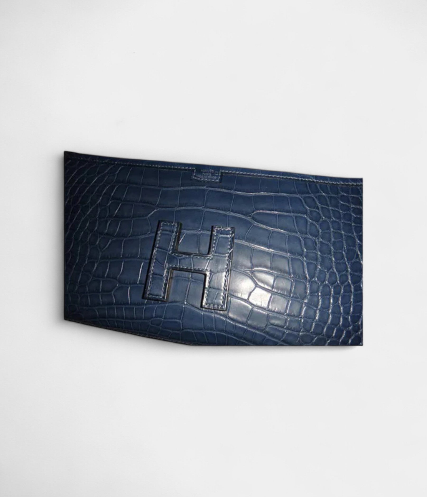 The Hermès Jige 29 Clutch in Blue Alligator is a stunning blend of luxury and sophistication, showcasing the brand’s dedication to exceptional craftsmanship. Crafted from exquisite Blue Alligator leather, known for its unique texture and striking shine, this clutch features a sleek, minimalist design with the signature flap closure.