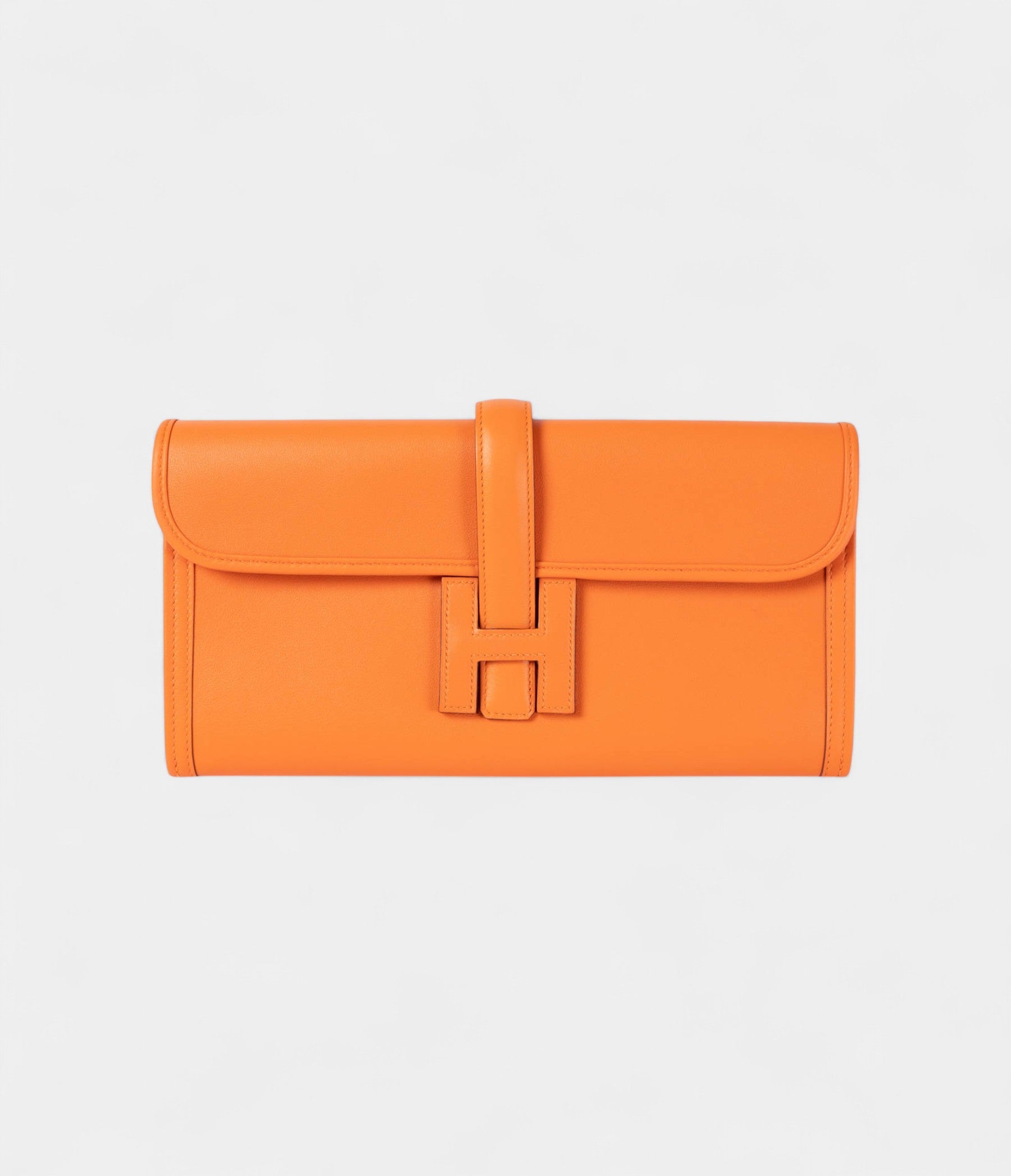 The Hermès Jige 29 Clutch in Orange Swift leather is a bold and vibrant accessory that combines refined craftsmanship with eye-catching color. Crafted from Swift leather, known for its soft texture and smooth finish, this clutch features the signature sleek design that defines the Jige collection.