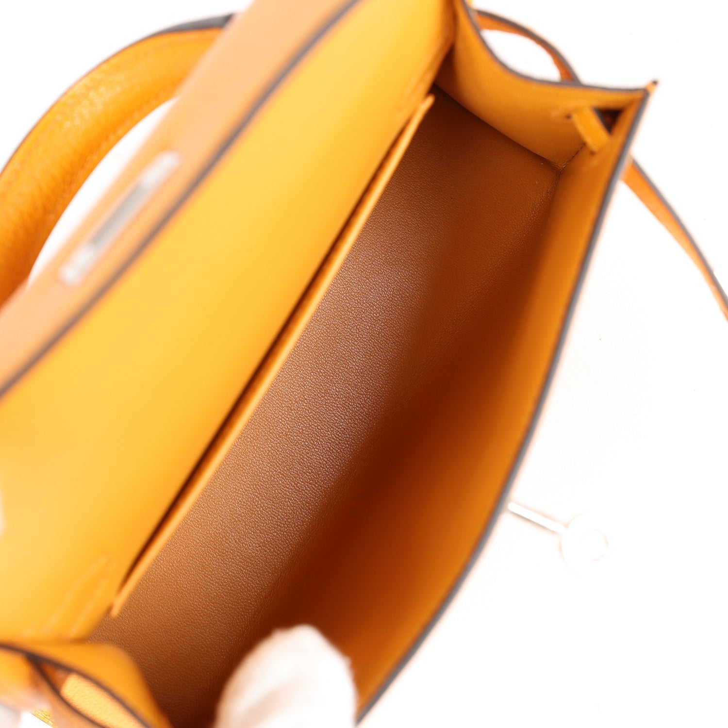 The interior is lined with Moutarde lambskin leather and has one open pocket on the back wall.