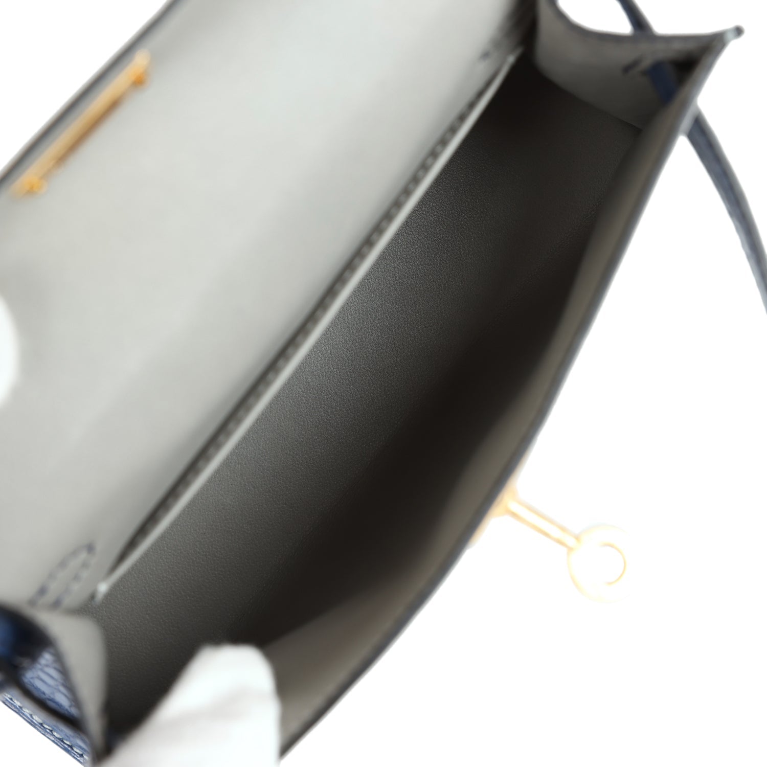 This Special Order Kelly, in the Sellier style, is in Gris Perle andBleu de MalteMatte Mississippiensis alligator with gold hardware and has tonal stitching, two straps with front toggle closure, single rolled handle and removable shoulder strap.