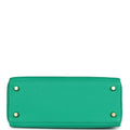 This Kelly Touch, in the Retourne style, is in Menthe Togo and Varanus Niloticus Lizard leather with permabrass hardware and has tonal stitching, two straps with front toggle closure, clochette with lock and two keys, single rolled lizard handle and removable shoulder strap.