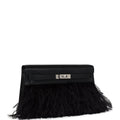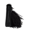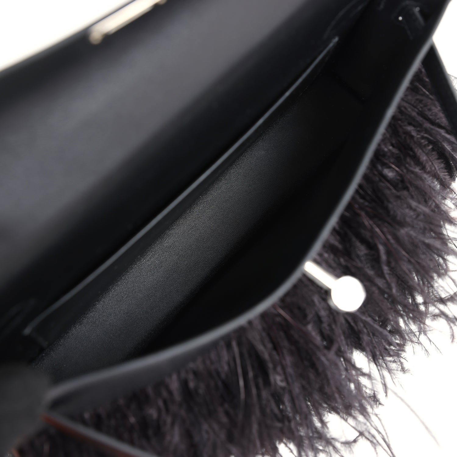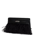 This Kelly Elan Foile Black chevre chamkila leather and ostrich feathers with palladium hardware, two pull straps that attach to a toggle, ostrich feathers on front of bag, and an interior that has snaps for detachable shoulder strap.