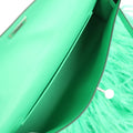 This Kelly Elan is in Vert Comics chevre and ostrich feathers with palladium hardware, two pull straps that attach to a toggle, and an interior that has snaps for shoulder strap.