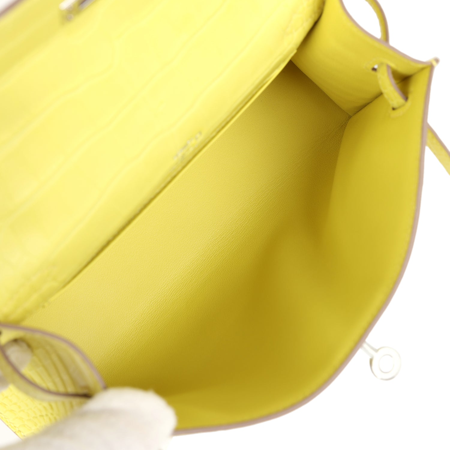The interior is lined in Lime lambskin leather and has one open slit pocket on the back wall.