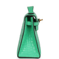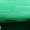 This Kelly Pochette is in Vert Comics Matte Alligator Mississippiensis leather with gold hardware and has tonal stitching, front flap, two straps with center toggle closure and a top flat handle.