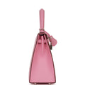 This Kelly, in the Sellier style, is in Pink 5P madame leather with palladium hardware and has tonal stitching, two front straps with toggle closure, clochette with lock and two keys, single rolled handle and removable shoulder strap.
