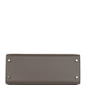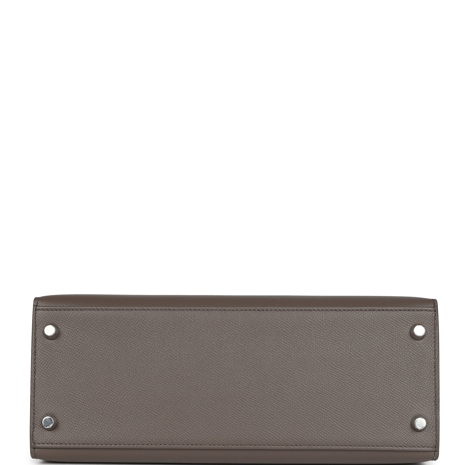 This Kelly, in the Sellier style, is in Etain epsom leather with palladium hardware, tonal stitching, front flap with two straps, front toggle closure, clochette with lock and two keys, single rolled handle, and a removable shoulder strap.