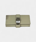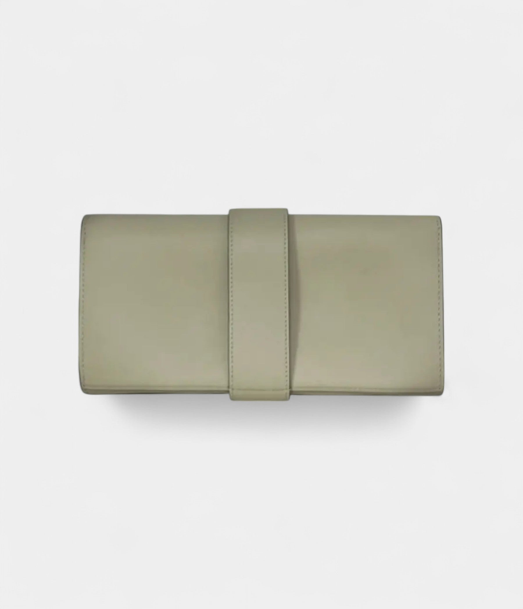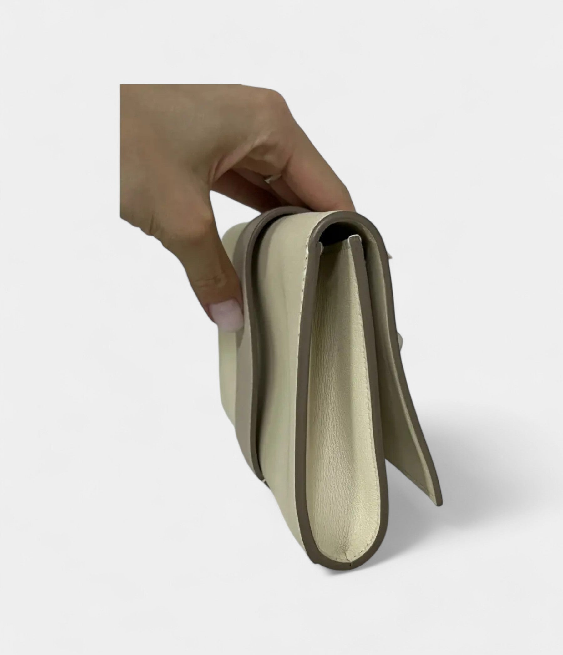 The soft beige hue offers versatility, seamlessly complementing a range of ensembles from day to evening. Measuring approximately 23 cm in length, it provides a sleek silhouette that's both compact and spacious enough to hold essentials for an evening out. The interior is lined with supple leather and features a convenient slip pocket, ensuring functionality without compromising on style.