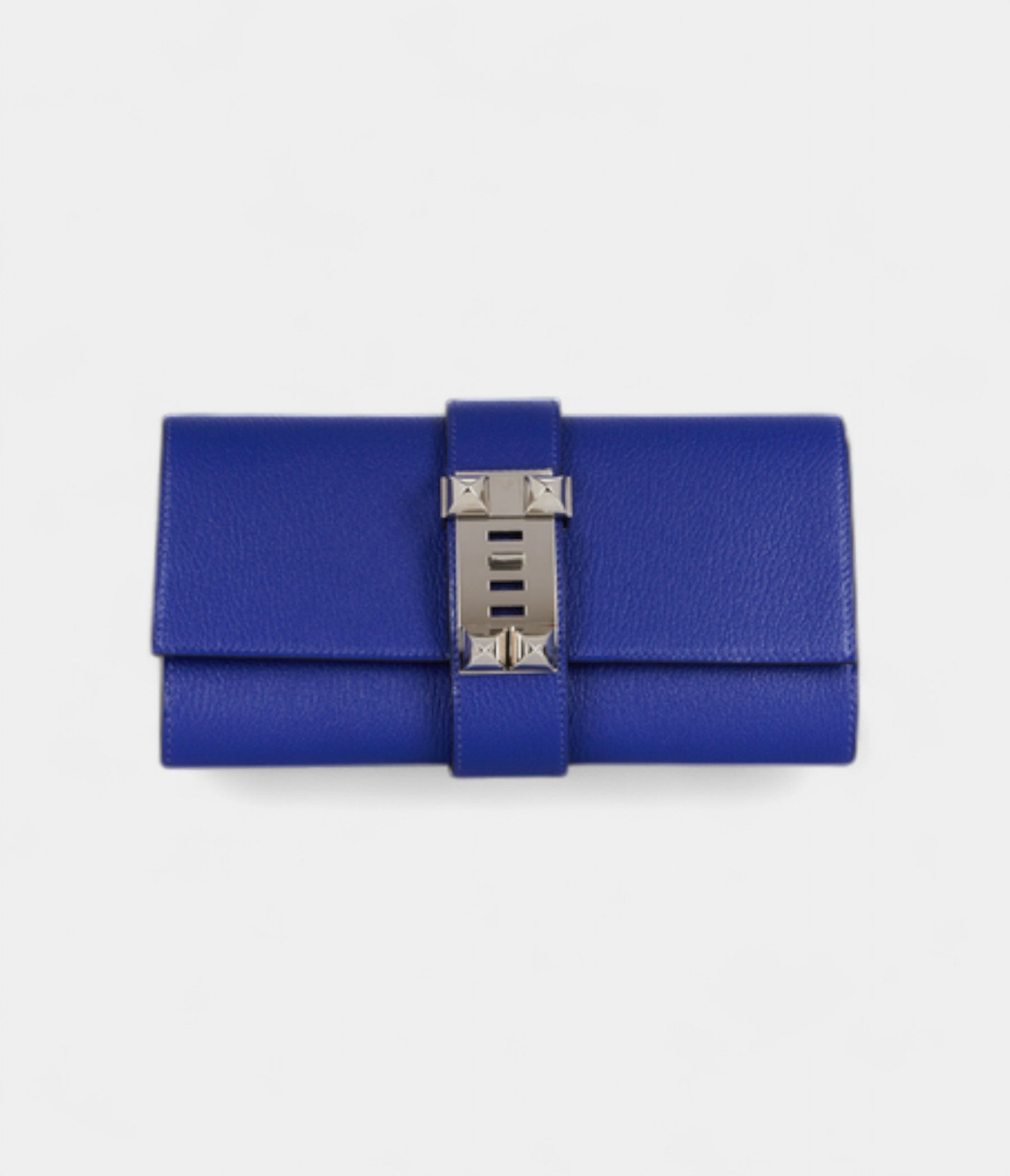 The Hermès Médor Clutch in blue leather is a striking fusion of minimalist design and bold detailing. Crafted from luxurious leather, this clutch showcases the iconic Médor closure—a gleaming clasp adorned with pyramid-shaped studs, inspired by the brand's signature Collier de Chien motif.