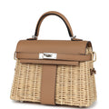This rare Mini Picnic Kelly Bag is in Chai swift leather and Osier wicker with palladium plated hardware and has tonal stitching, two straps with toggle closure, single rolled handle and shoulder/crossbody strap.