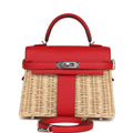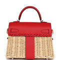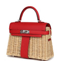 This rare Mini Picnic Kelly Bag is in Rouge De Coeur swift leather and Osier wicker with palladium plated hardware and has tonal stitching, two straps with toggle closure, single rolled handle and shoulder/crossbody strap.