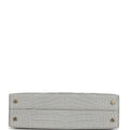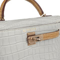 This Special Order Kelly, in the Sellier style, is in Gris Perle and Kraft Matte Alligator Mississippiensis leather with permabrass hardware, a mixture of tonal and contrast stitching, front flap with two straps, front toggle closure, removable shoulder strap and single rolled handle.