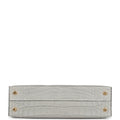 This Special Order Kelly, in the Sellier style, is in Gris Perle and Black Matte Alligator Mississippiensis leather with gold hardware, contrast stitching, front flap with two straps, front toggle closure, removable shoulder strap and single rolled handle.