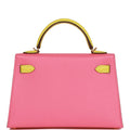 This tiny Horseshoe Stamp Kelly, in the Sellier style, is in Rose Azalee and Lime epsom leather with gold hardware and has tonal stitching, two front straps with front toggle closure, single rolled handle and removable shoulder strap.