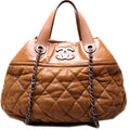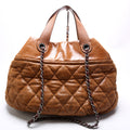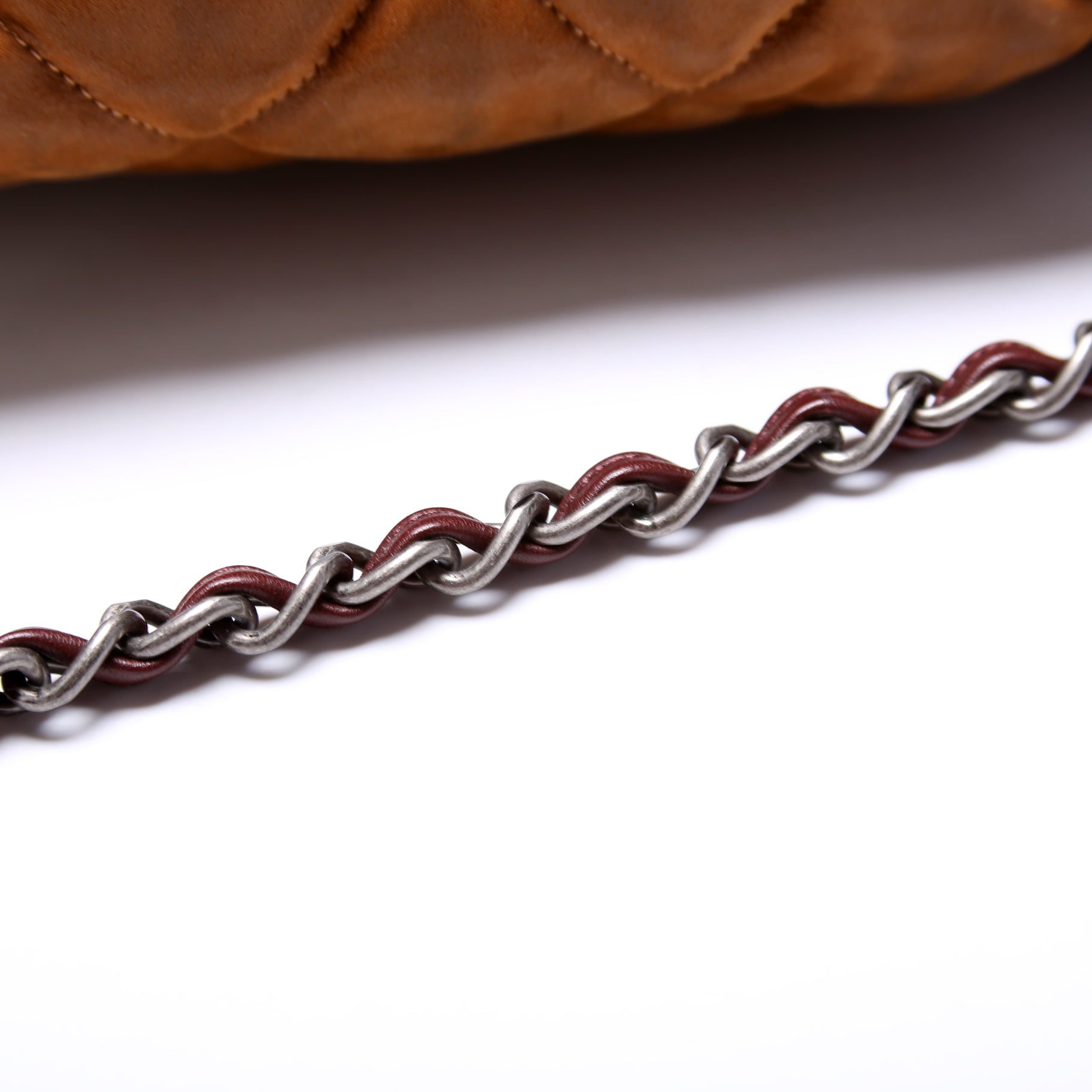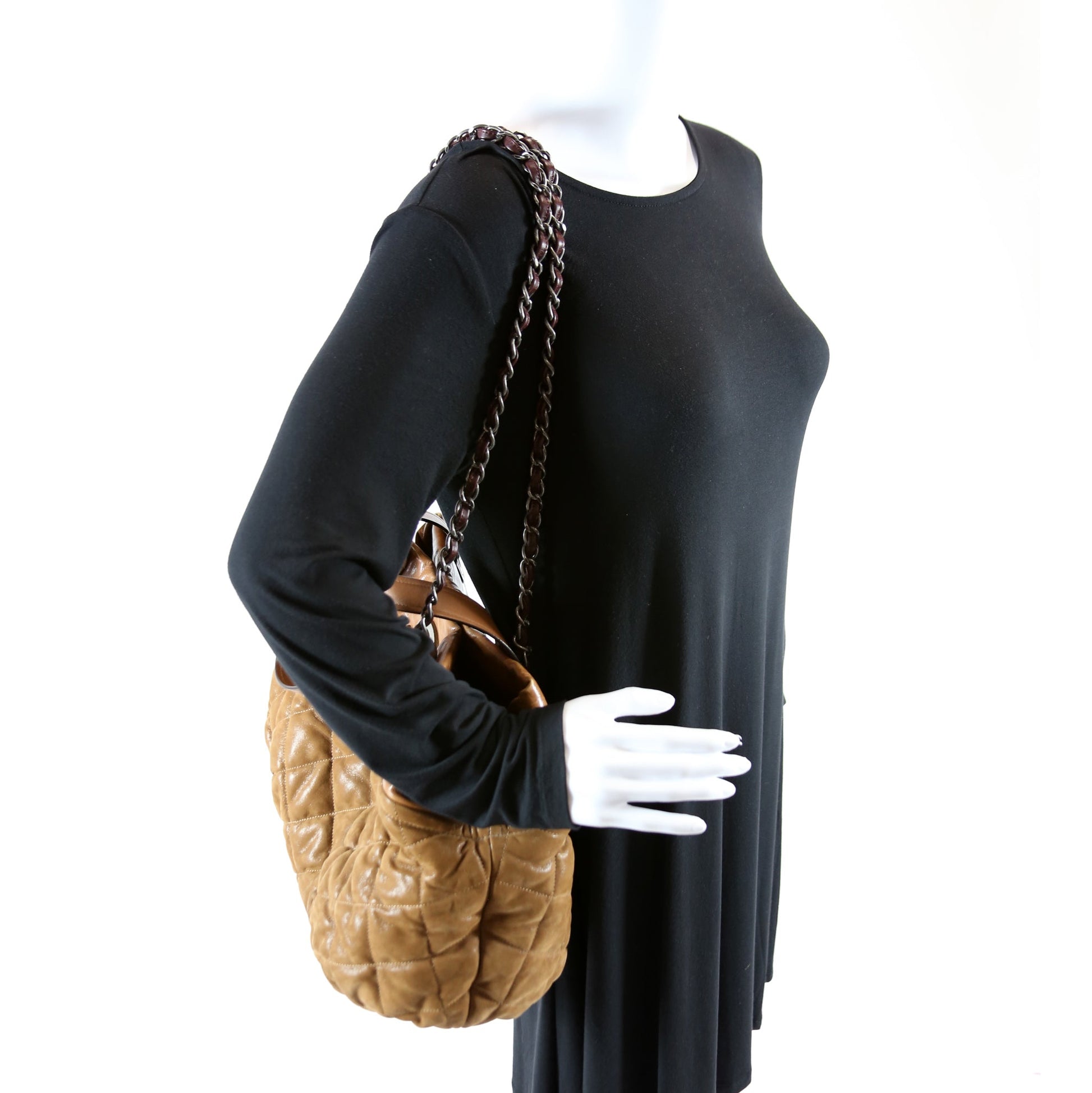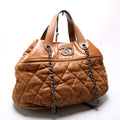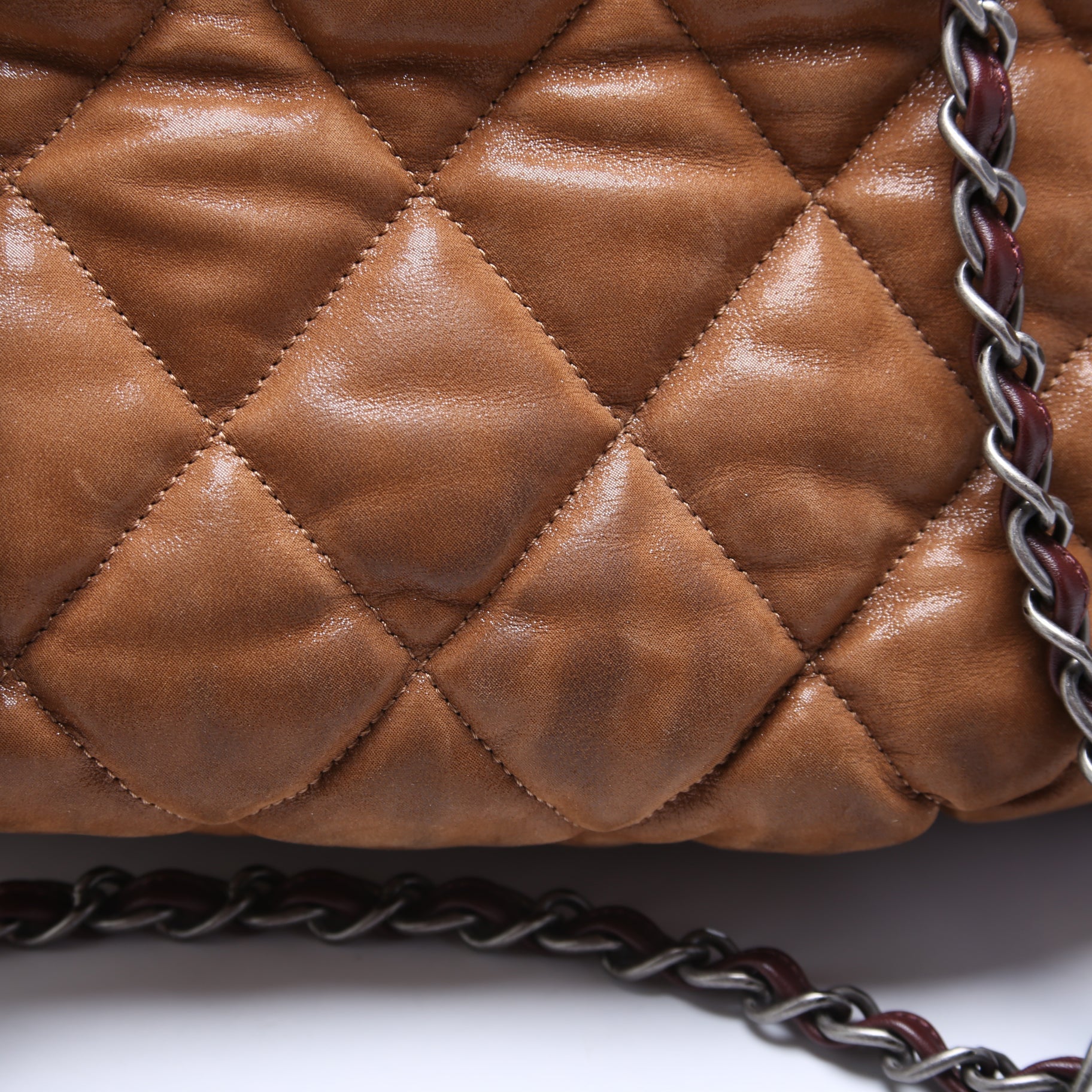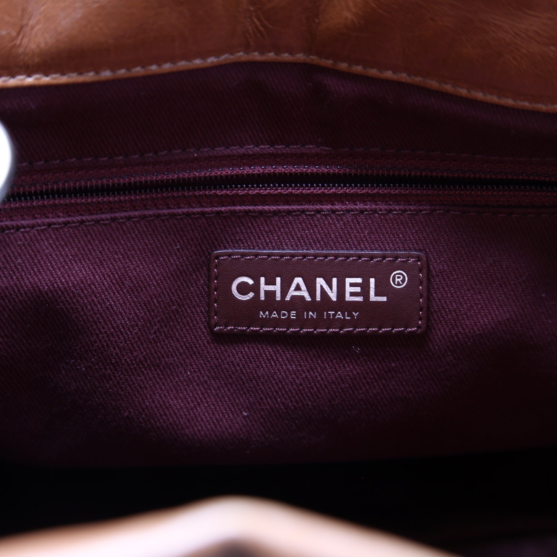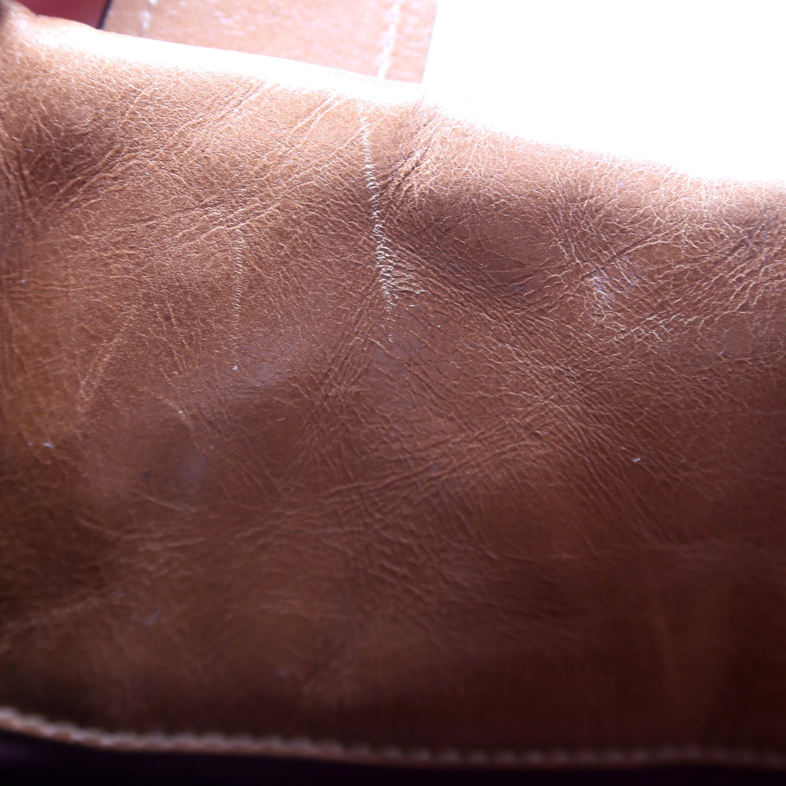 Exterior: The exterior leather shows minor wear and slight discoloration. Scuffing can be found near the top of the bag. The corners show discoloration and wear.