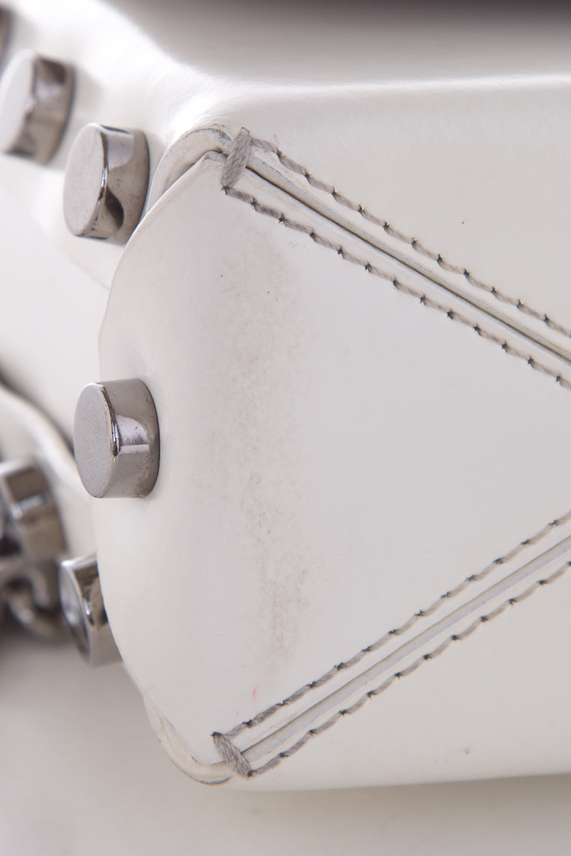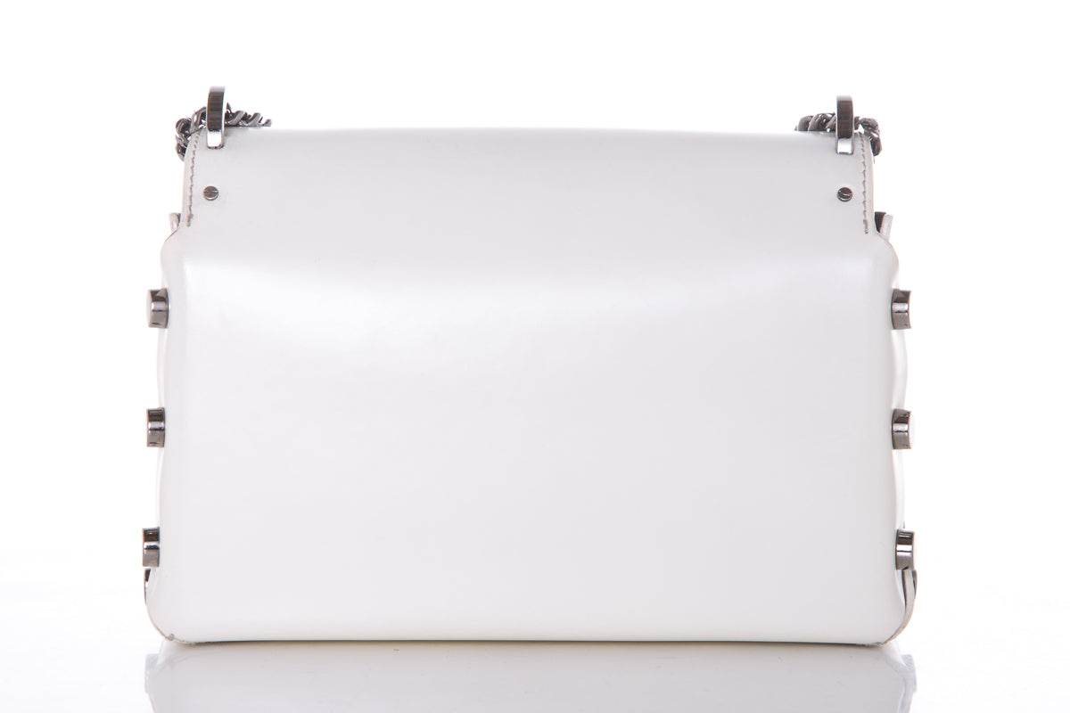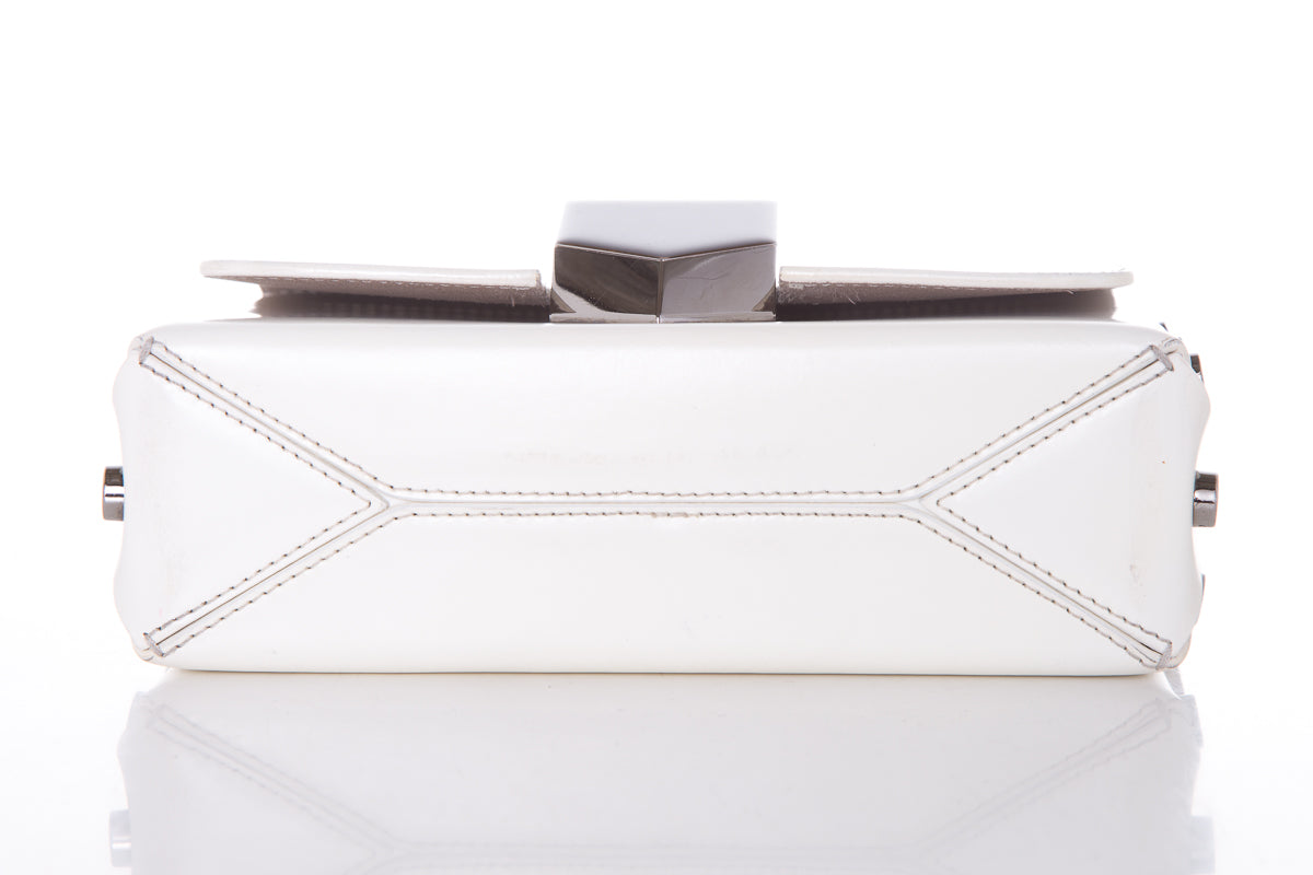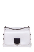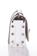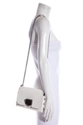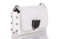 Jimmy Choo White Varenne Quad Cross-Body with gun metal hard ware, and stud detail. This item is in good condition with slight scratching to hardware, slight marks to leather on bottom edge and interior.