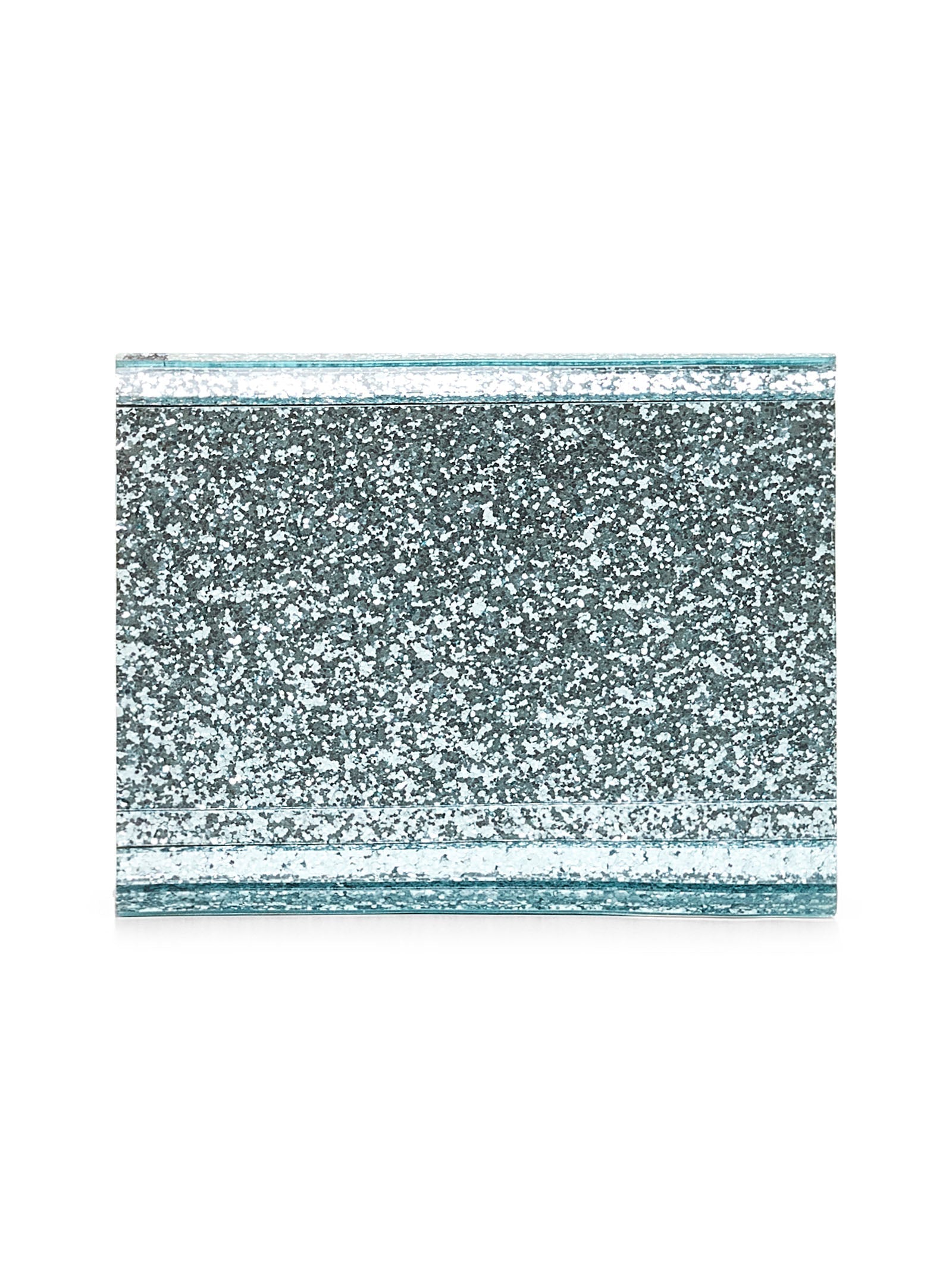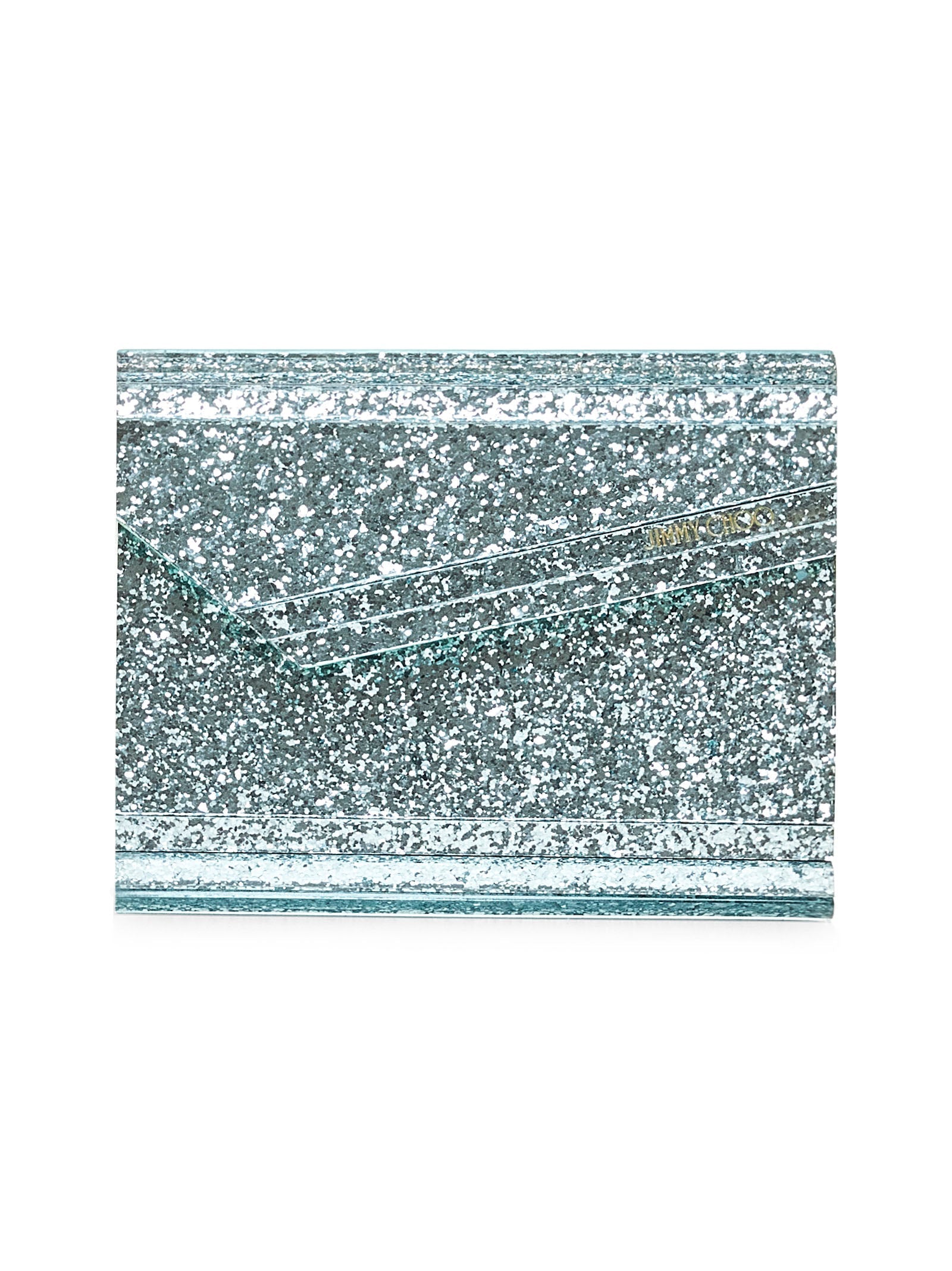 •Asymmetrical foldover-top with magnetic fastening •Gold-toned metal chain shoulder strap •Golden logo at flap •Side aqua green metallic leather inserts •One main compartment, one flat pocket with Jimmy Choo engraved tag; satin lining •Glitter-finish acrylic design with ribbed inserts •17 X 11 X 5 cm; shoulder strap drop: 55 cm •Aqua green color •100% Acrylic •Made in Italy