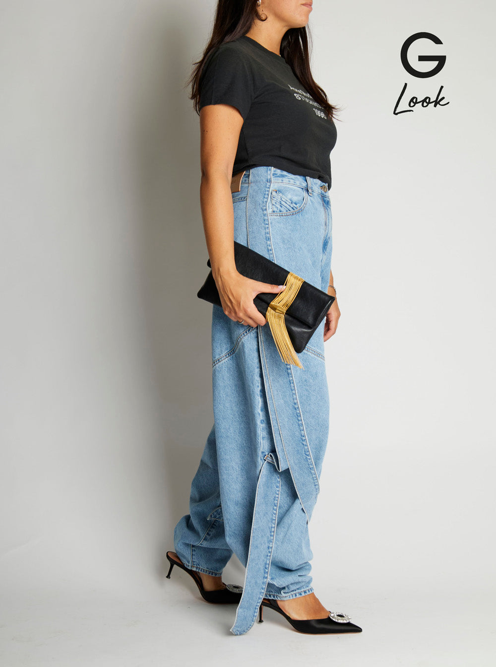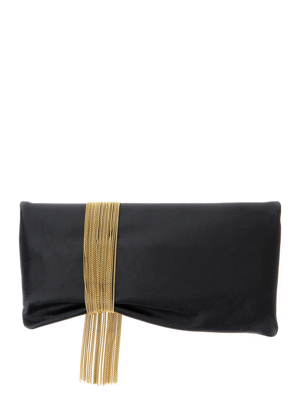 Clutch Black Foldover top Magnetic closure Pendant crystals Gold tone metalware Leather Dimensions: 30x15x2 cm