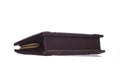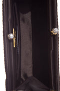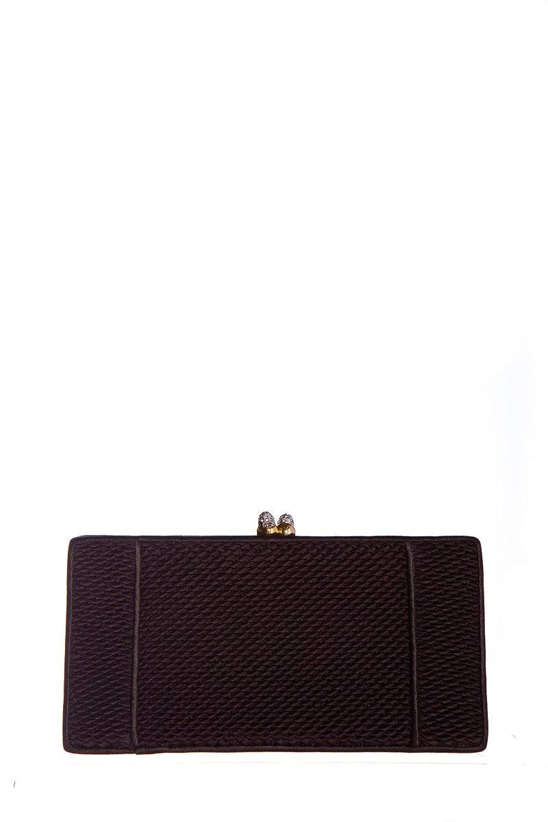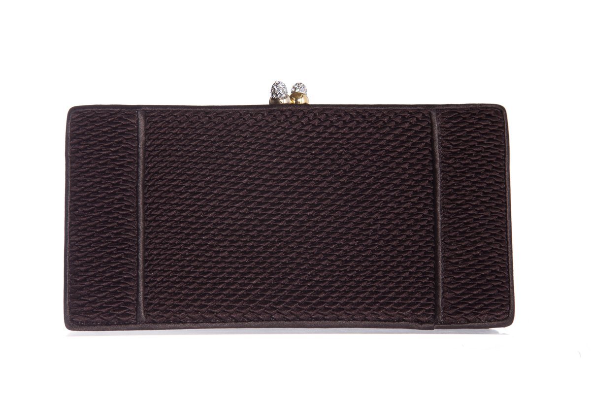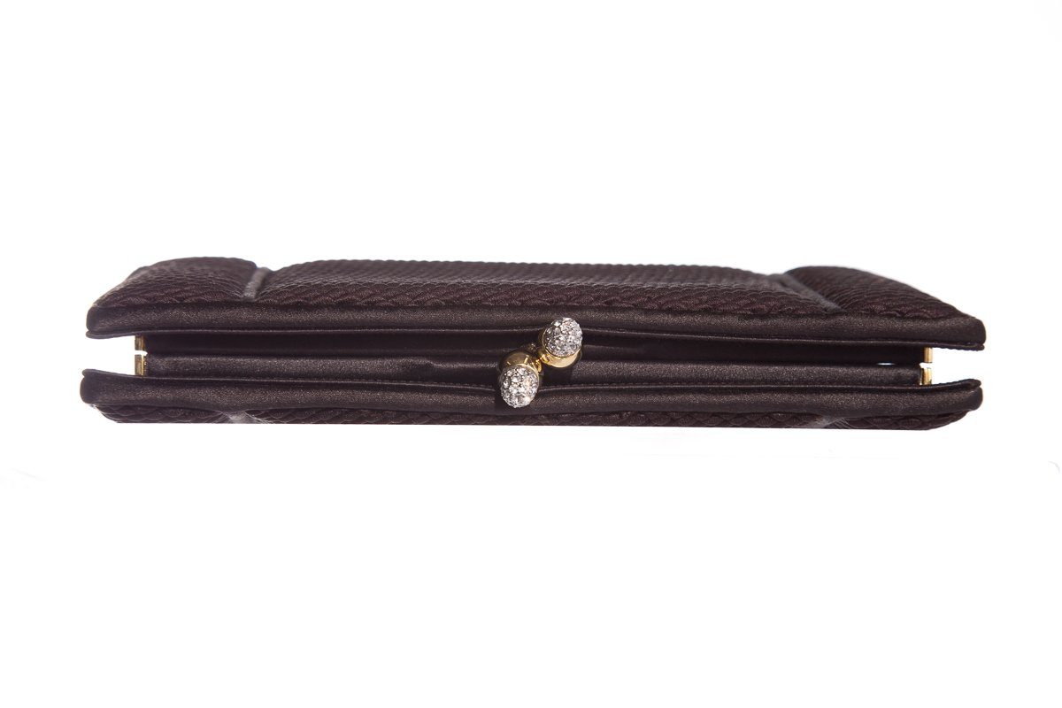 Judith Leiber brown clutch with gold-tone hardware, kiss-lock closure at top, and brown satin lining featuring a single slit pocket at the interior. This item is in excellent condition.