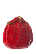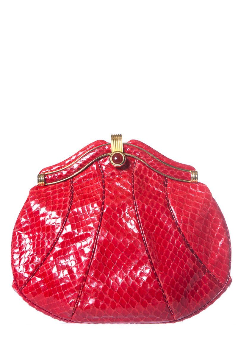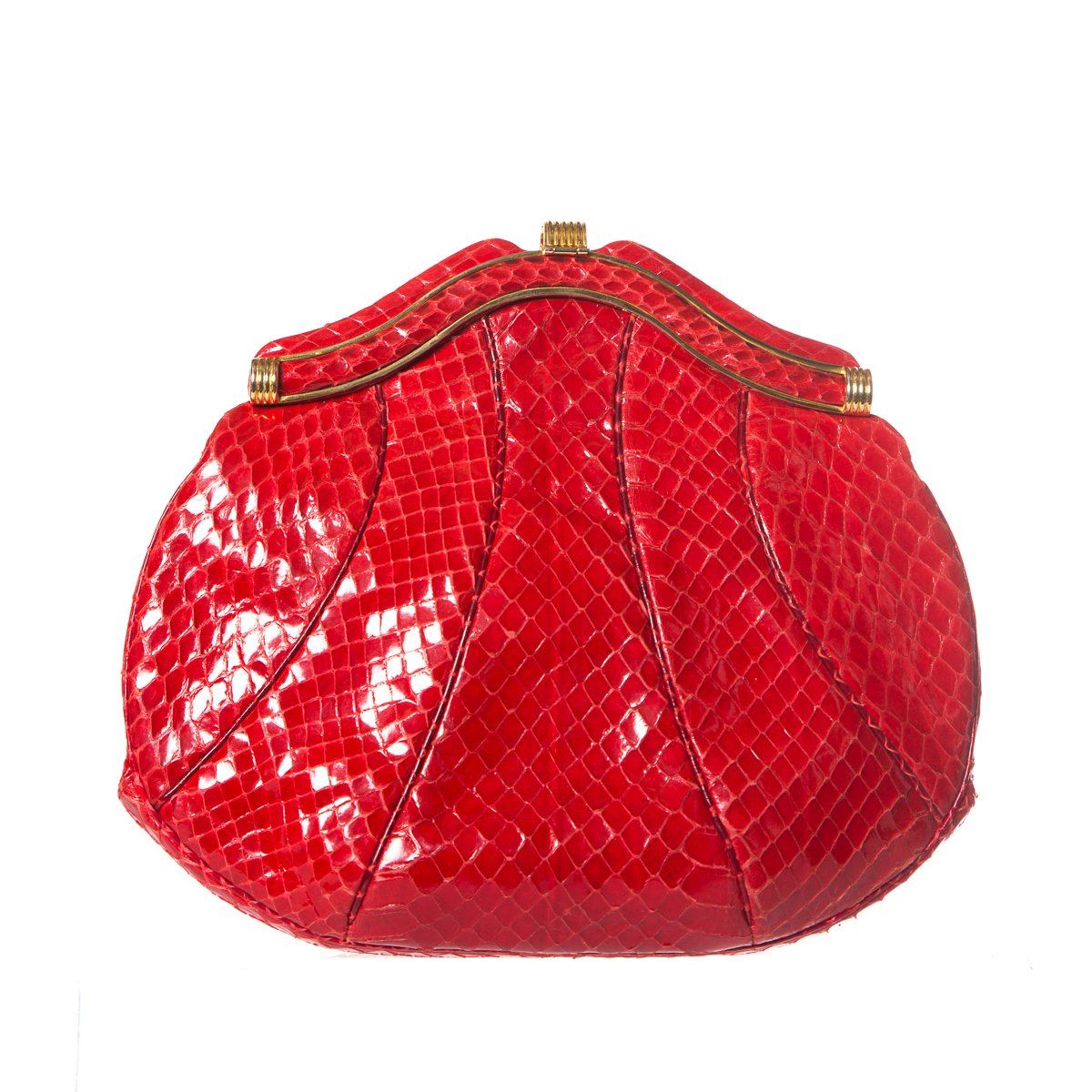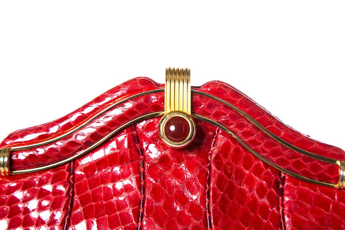 Judith Leiber Vintage red python leather clamshell clutch with gold-tone hardware, optional flat leather cross-body strap, tonal grosgrain lining, dual interior pockets; one with zip closure and flip-lock closure at top.