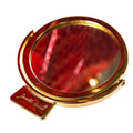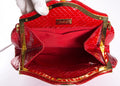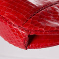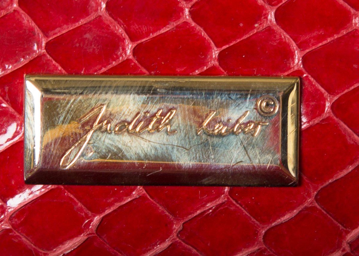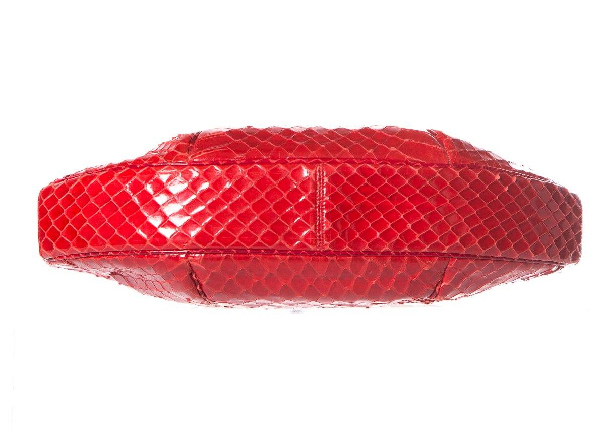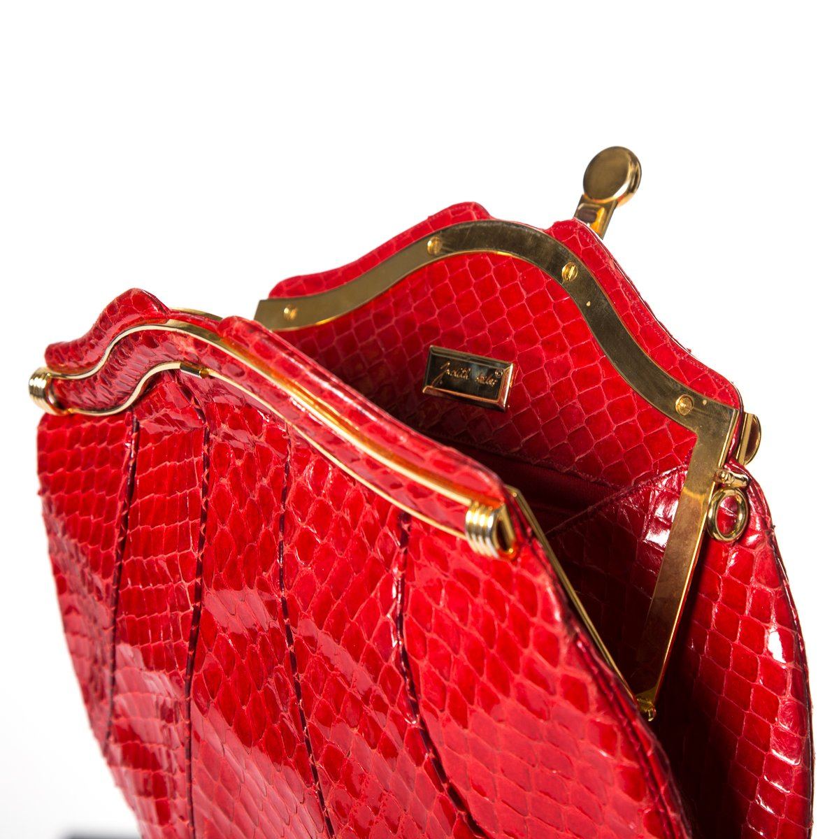 Judith Leiber Vintage red python leather clamshell clutch with gold-tone hardware, optional flat leather cross-body strap, tonal grosgrain lining, dual interior pockets; one with zip closure and flip-lock closure at top.