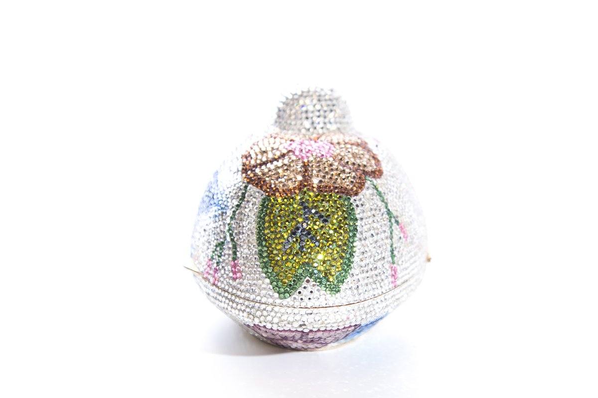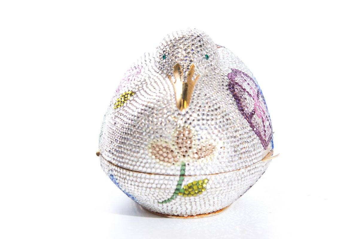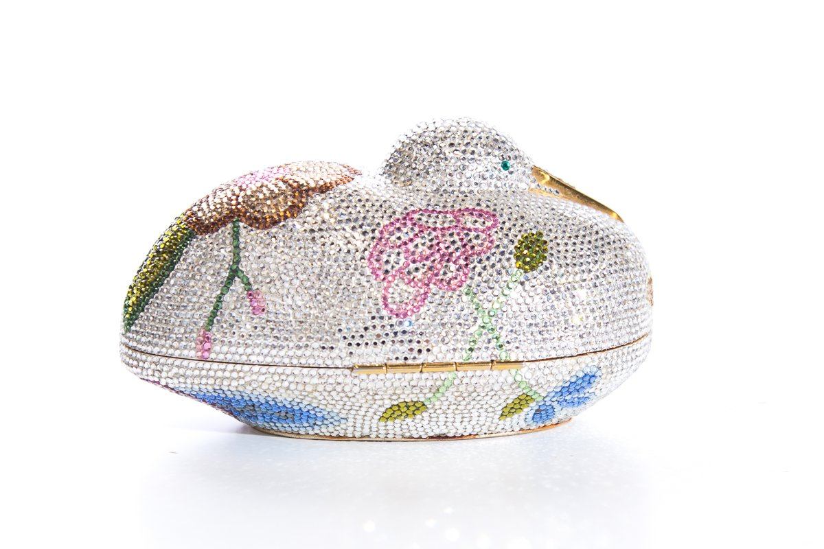 White crystal duck clutch with flowers and coin pouch. This item is in excellent condition.