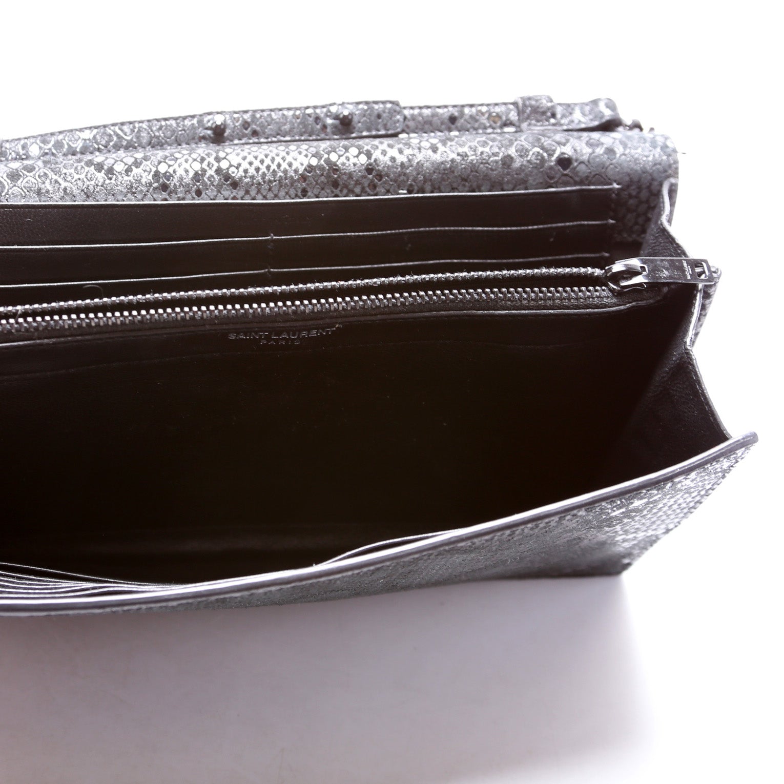 Interior: The interior has light scuffs throughout. The interior features twenty-four card slots, two open pockets, and one zip closure pocket.