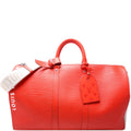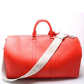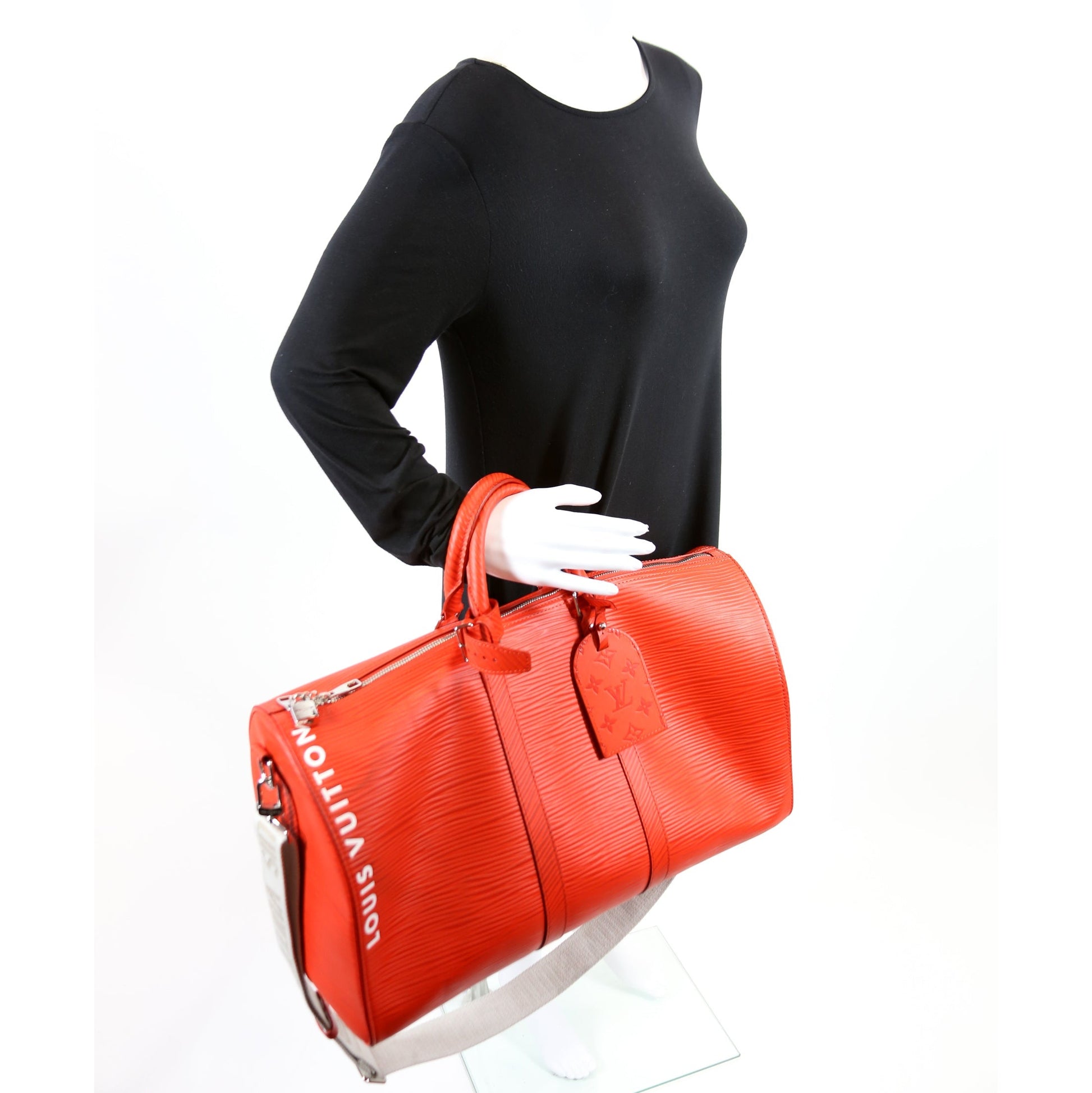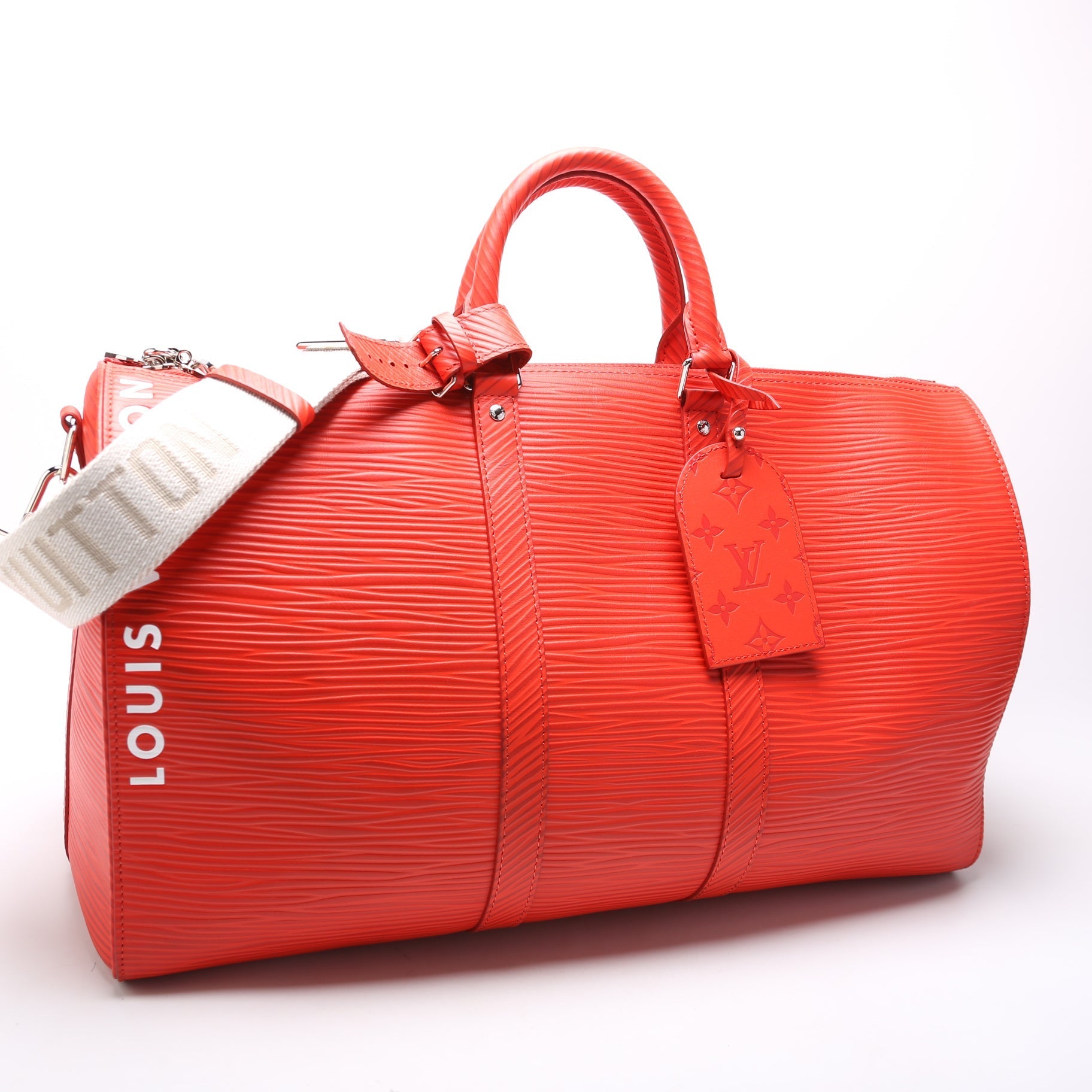 This Louis Vuitton Keepall 50is eye catching bag. The exterior is in the classic Louis Vuitton Epi leather.