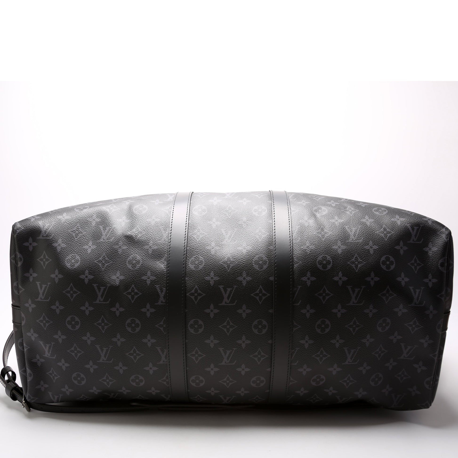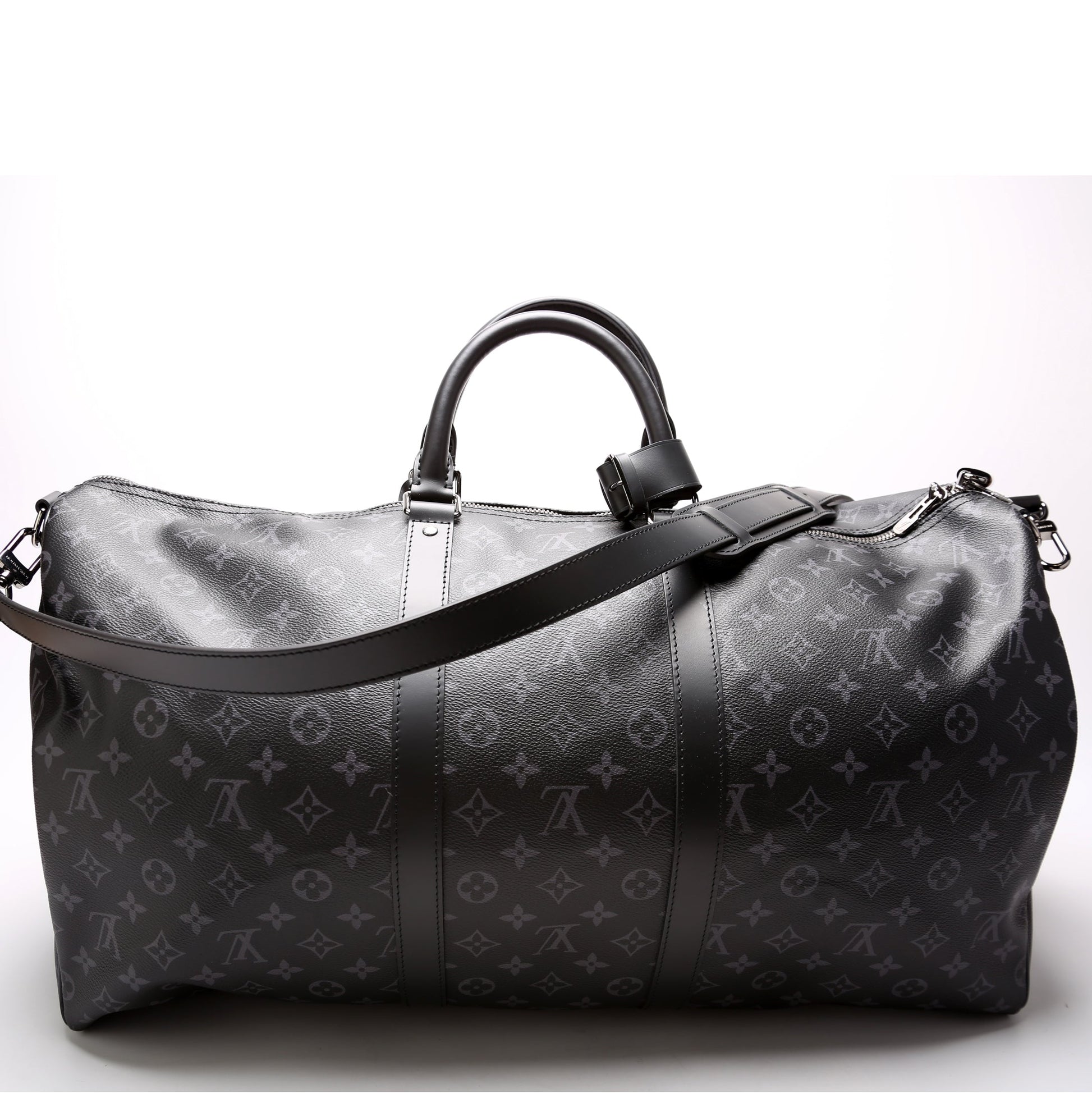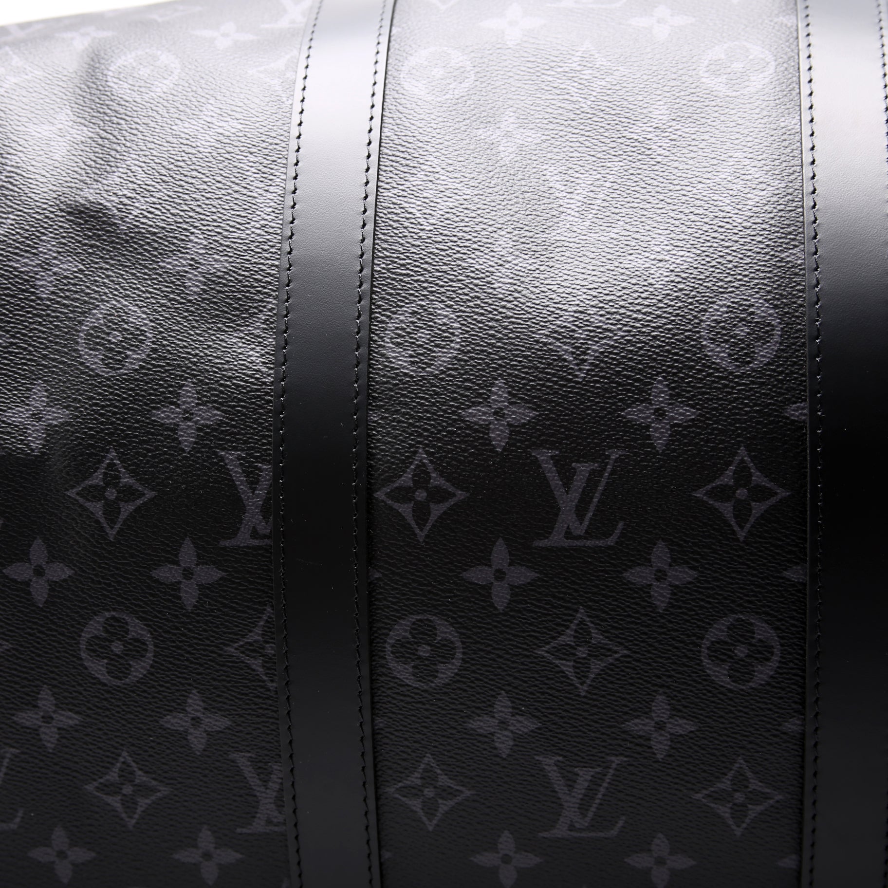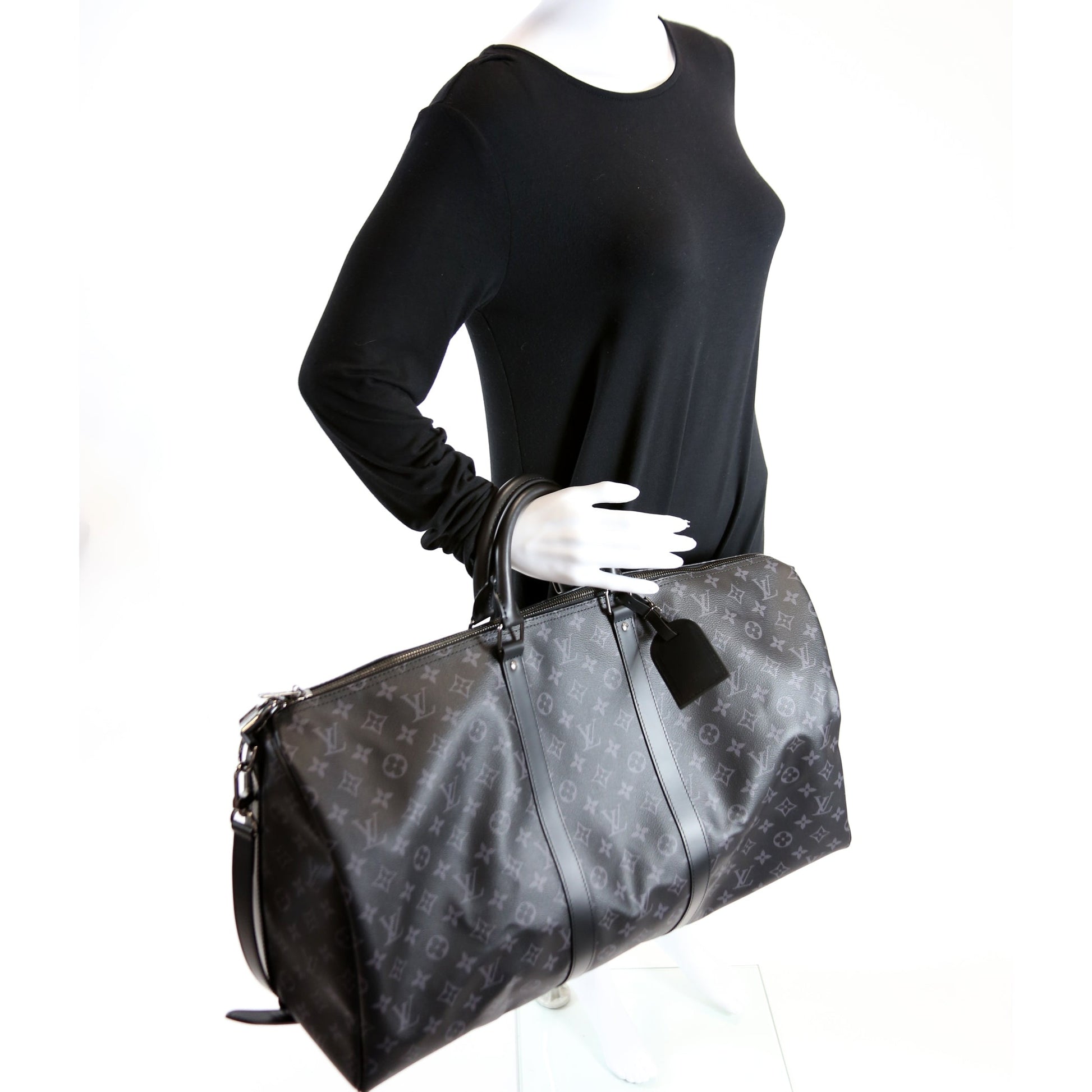 This Louis Vuitton Keepall 55 Bandouliereis eye catching bag. The exterior is in the classic Louis Vuitton Monogram Eclipse coated canvas.