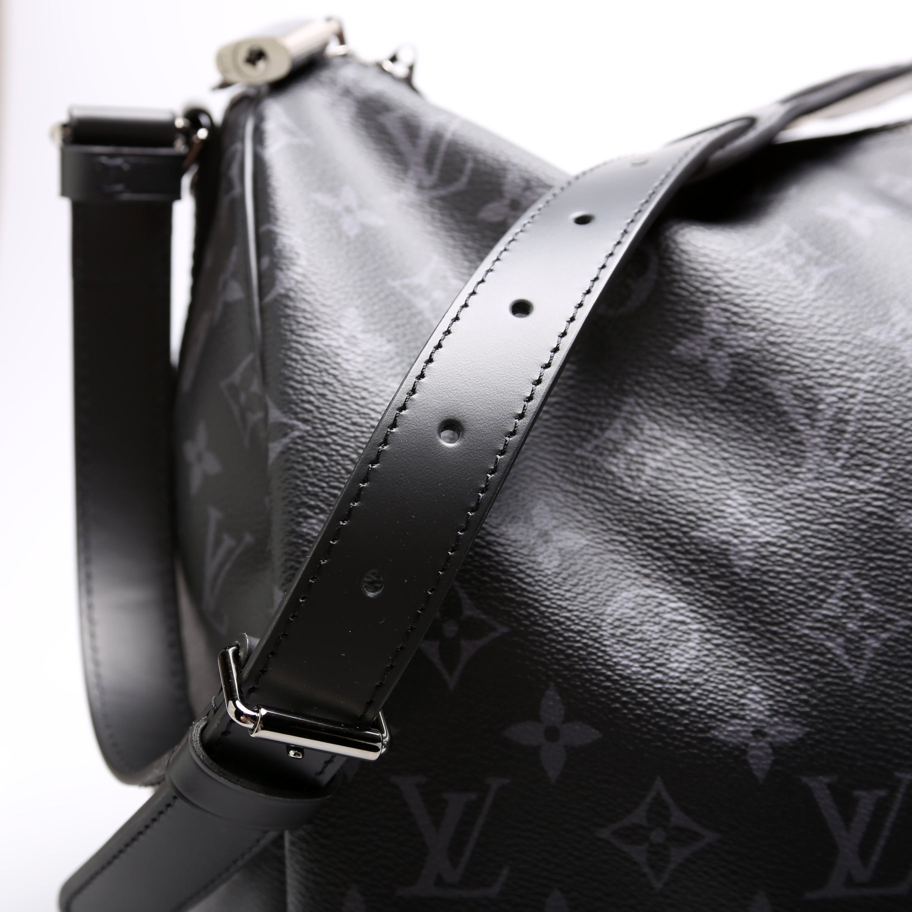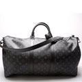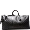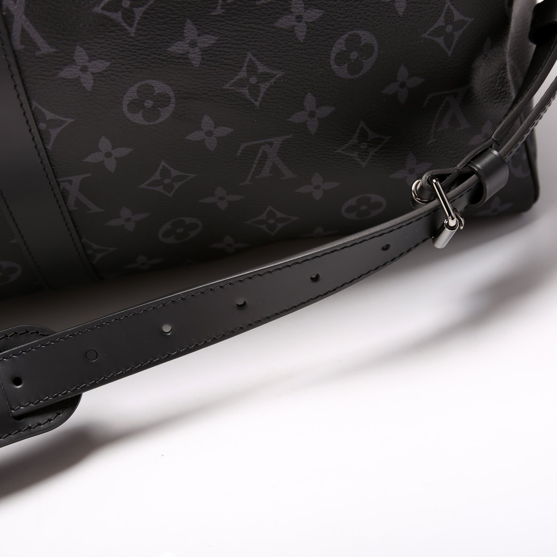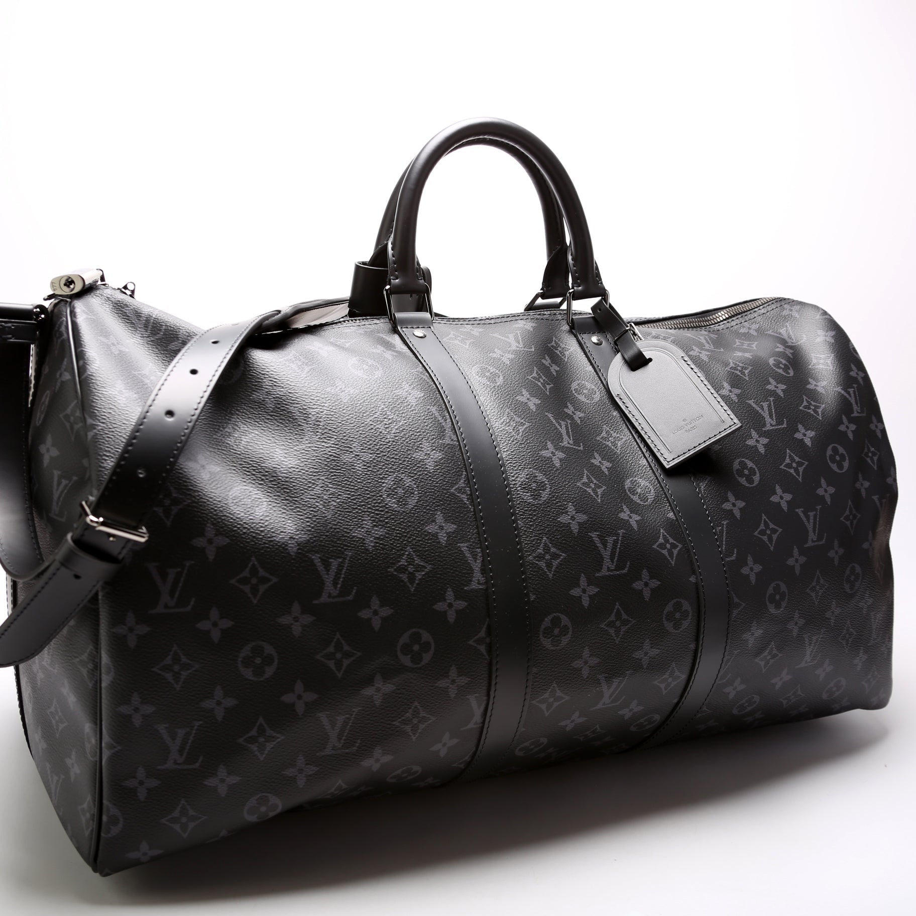 This Louis Vuitton Keepall 55 Bandouliereis eye catching bag. The exterior is in the classic Louis Vuitton Monogram Eclipse coated canvas.