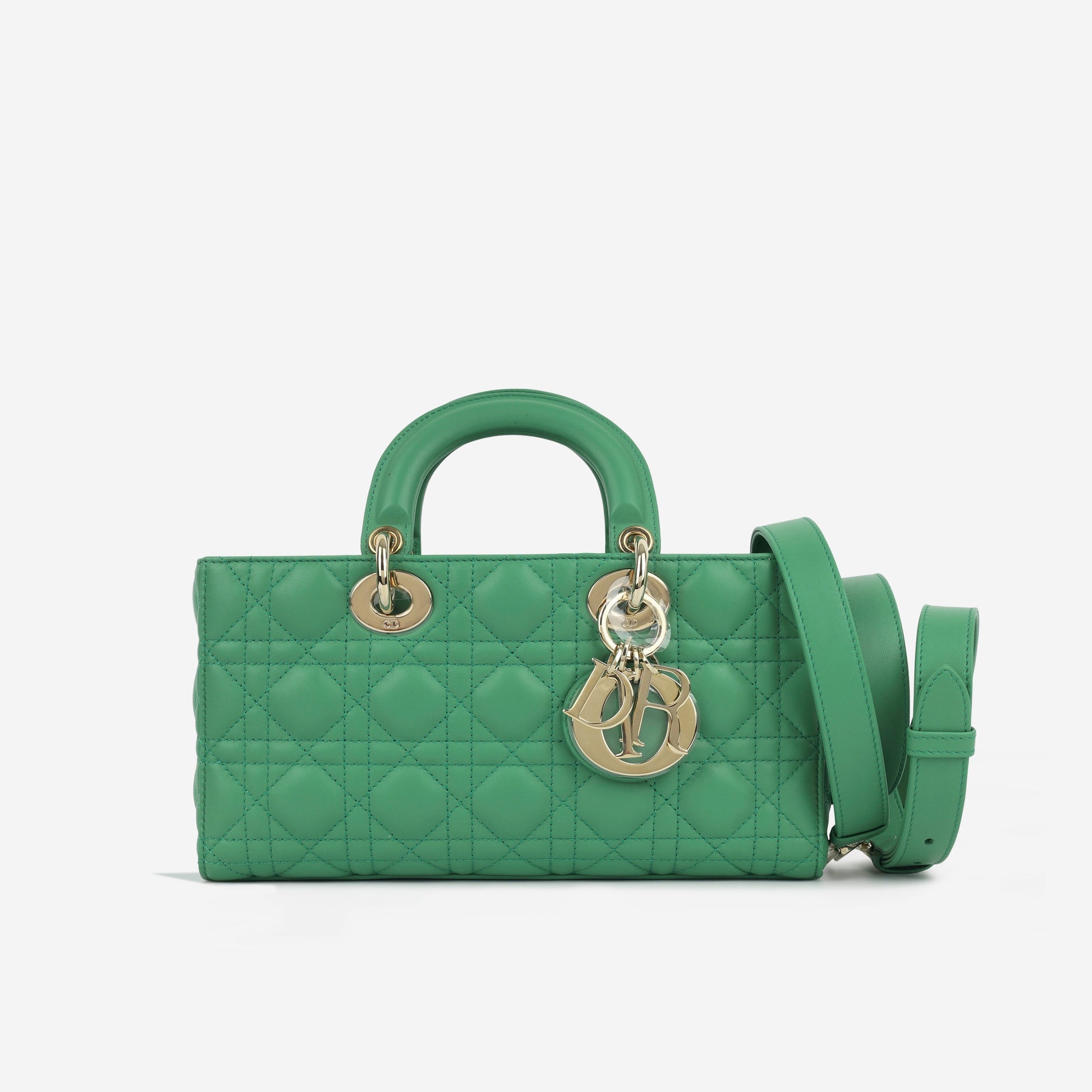 The Lady D-Joy bag effortlessly express the House's unwavering commitment to elegance and refined aesthetics, drawing inspiration from the iconic streamlined design of the renowned Lady Dior line. Crafted with precision from luxurious green lambskin and adorned with meticulous Cannage stitching, this masterpiece exudes a timeless style that is further elevated by the graceful presence of pale gold-finish metal D.I.O.R. charms delicately adorning its silhouette.