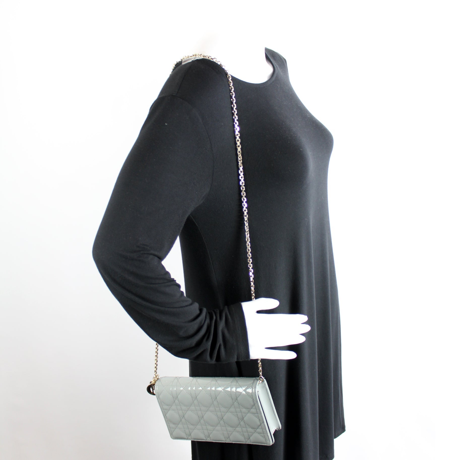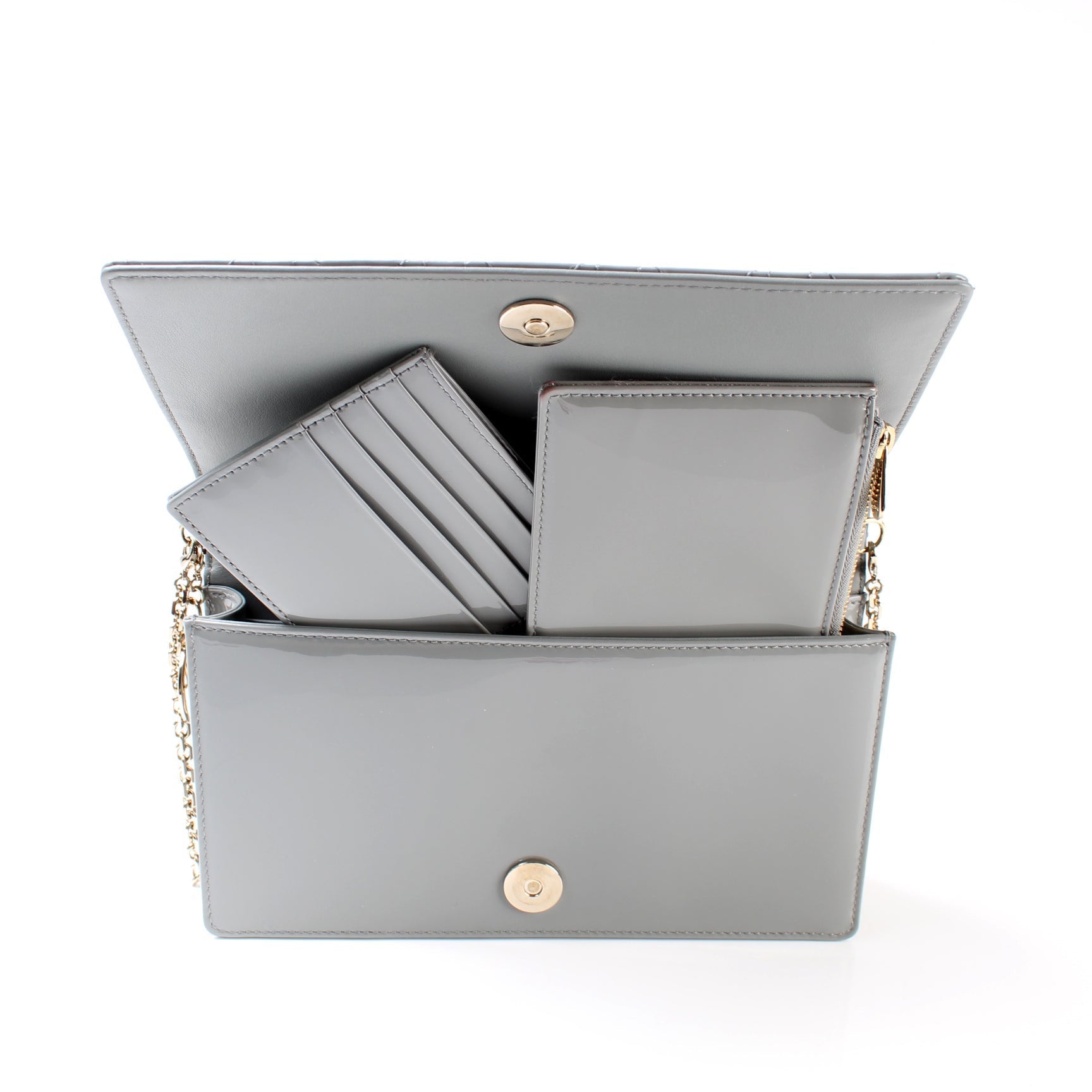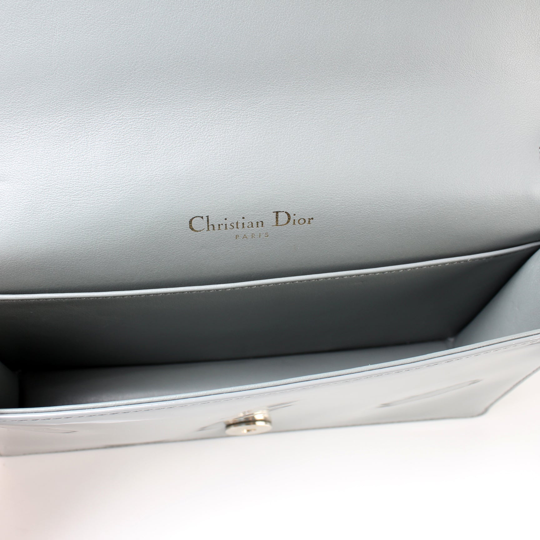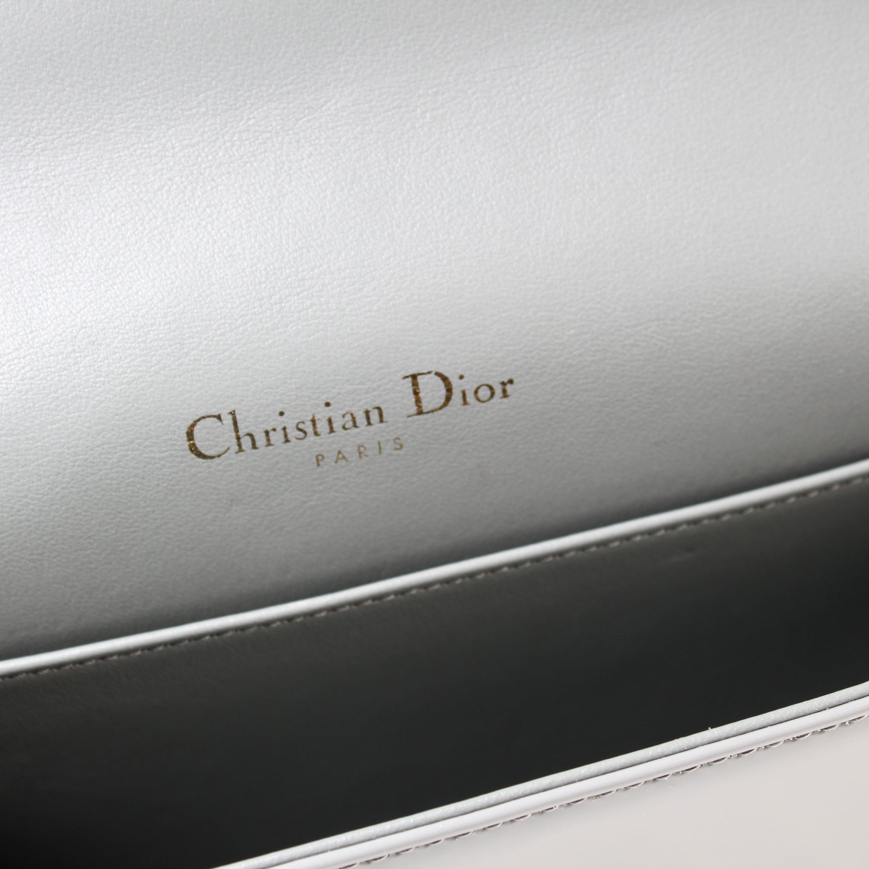This Christian Dior Lady Dior Pouch Clutchis eye catching bag. The exterior is in the classic Christian Dior patent Cannage leather.