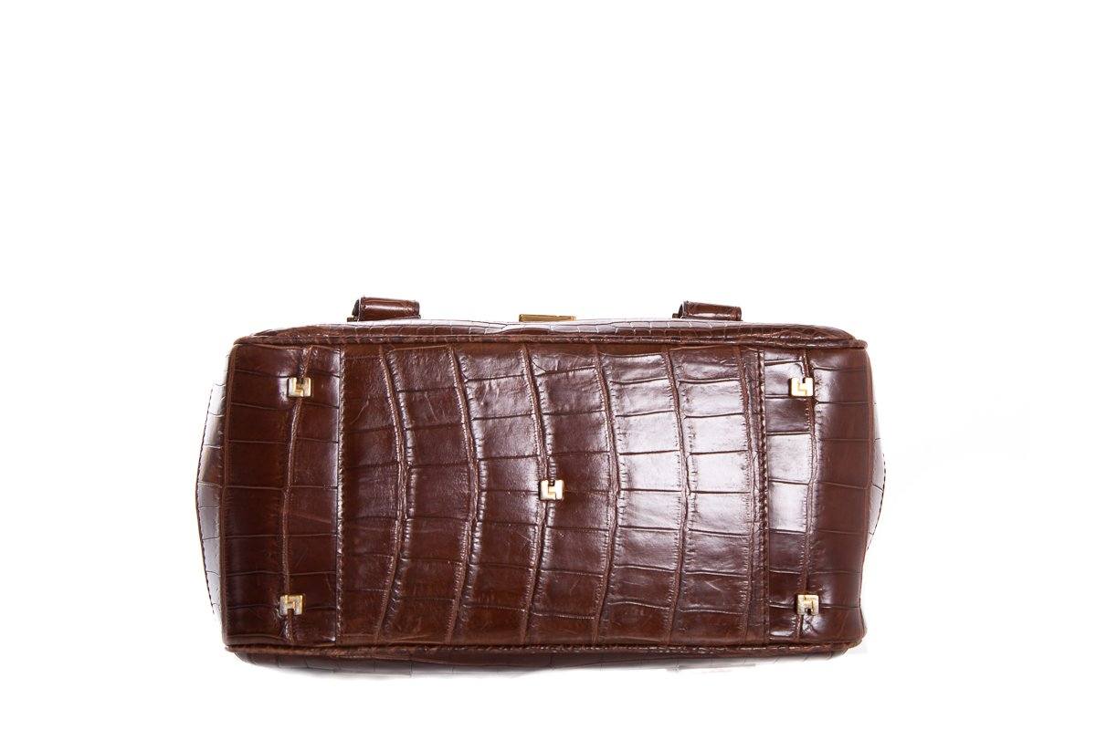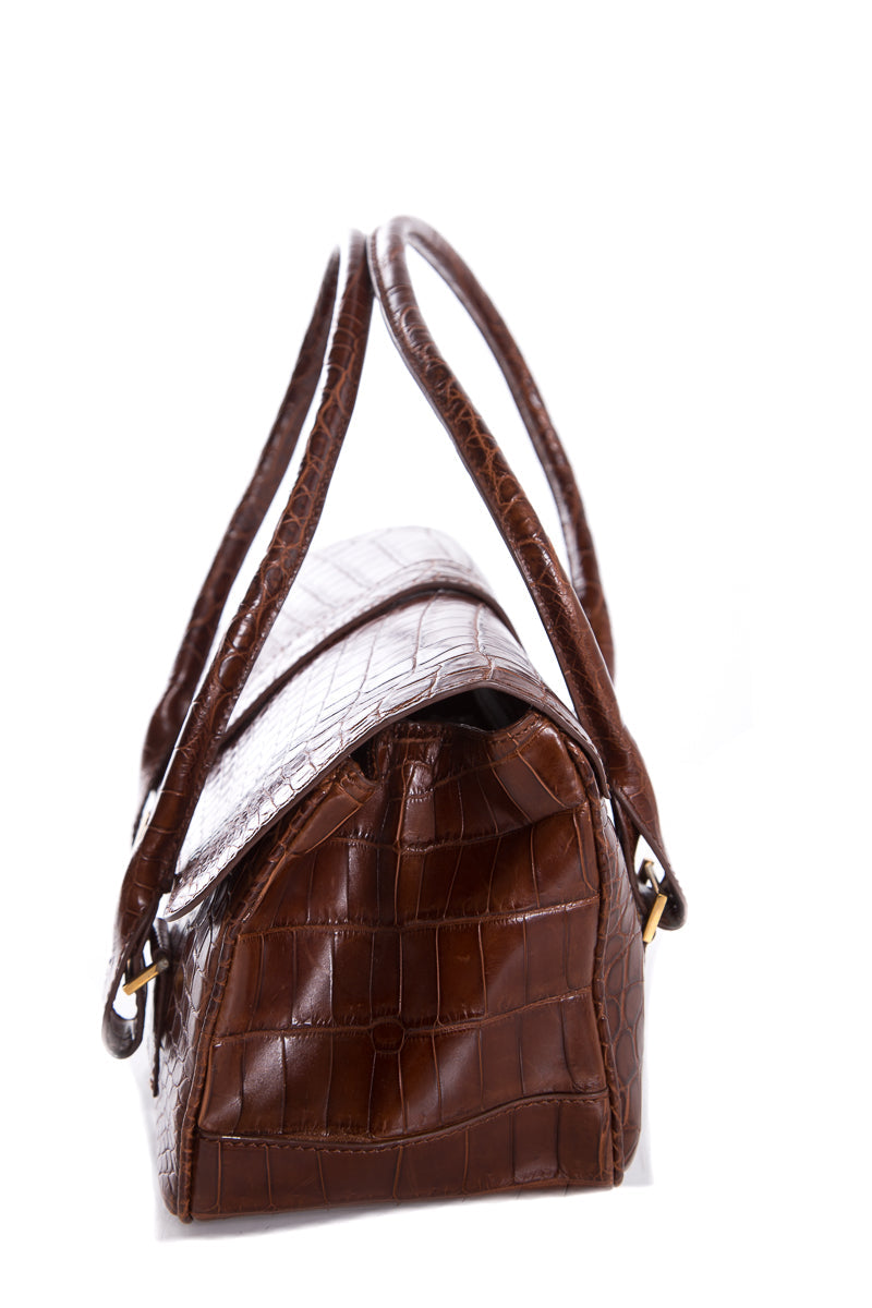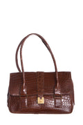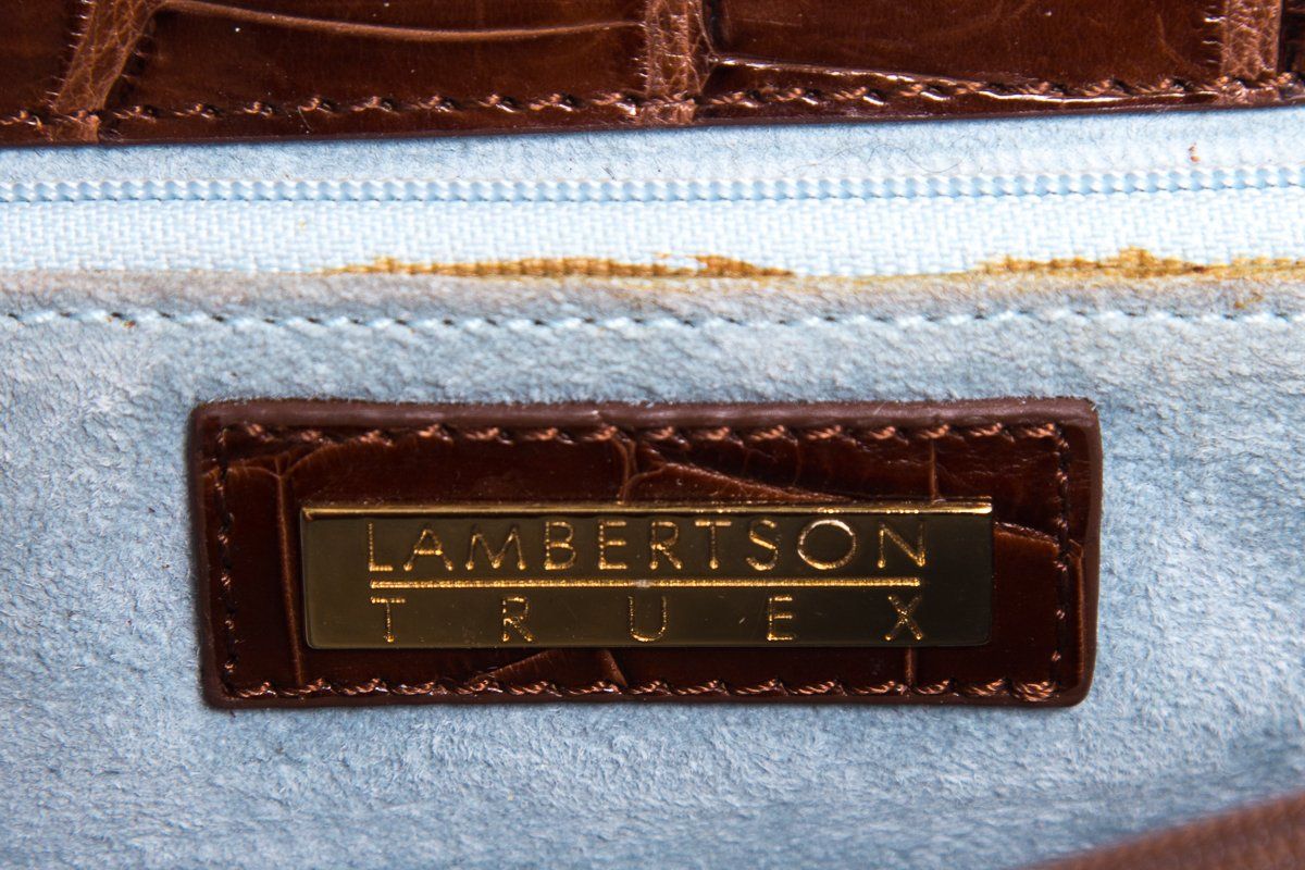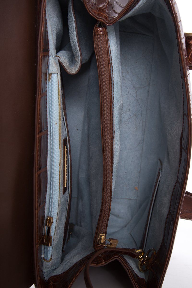 Brown alligator Lambertson Truex shoulder handbag with gold-tone hardware, dual rolled top handles, baby blue tonal suede lining, five interior pockets; two with zip closure & three slip pockets at interior & magnetic closure at front flap. This item is in good condition with some signs of wear. Wear includes light staining to lining, light scratching to hardware and scuffing to edges.