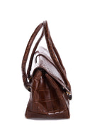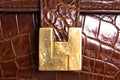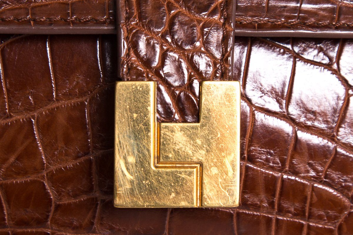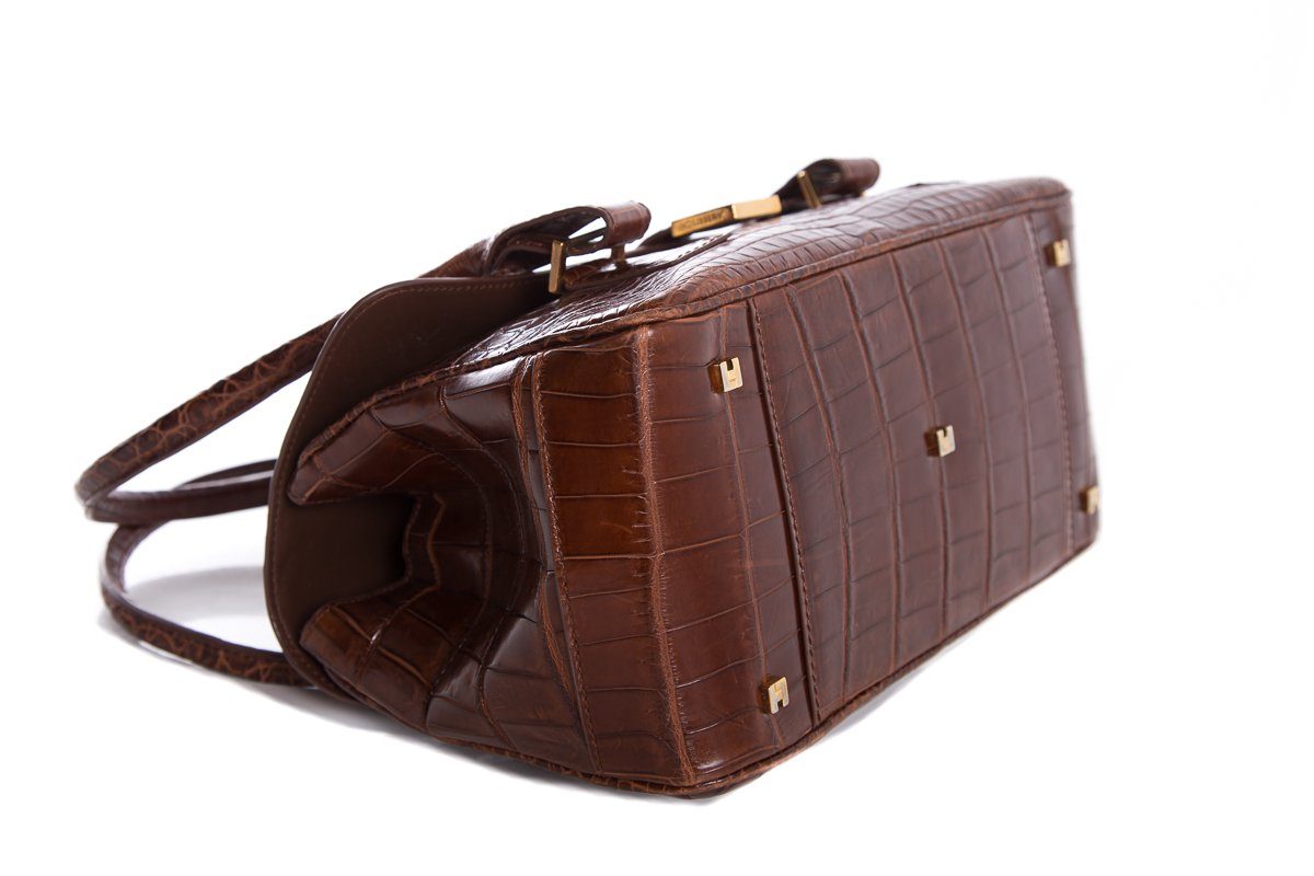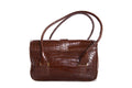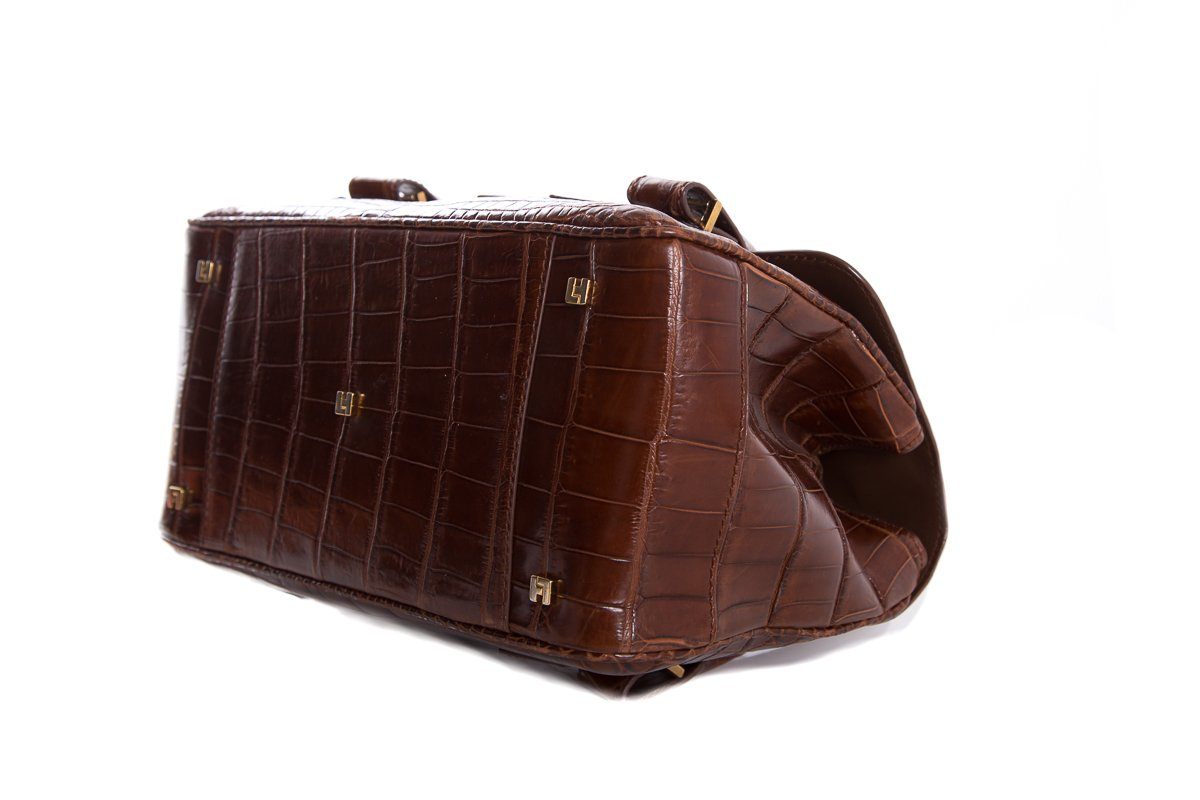 Brown alligator Lambertson Truex shoulder handbag with gold-tone hardware, dual rolled top handles, baby blue tonal suede lining, five interior pockets; two with zip closure & three slip pockets at interior & magnetic closure at front flap. This item is in good condition with some signs of wear. Wear includes light staining to lining, light scratching to hardware and scuffing to edges.