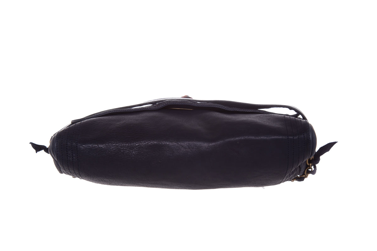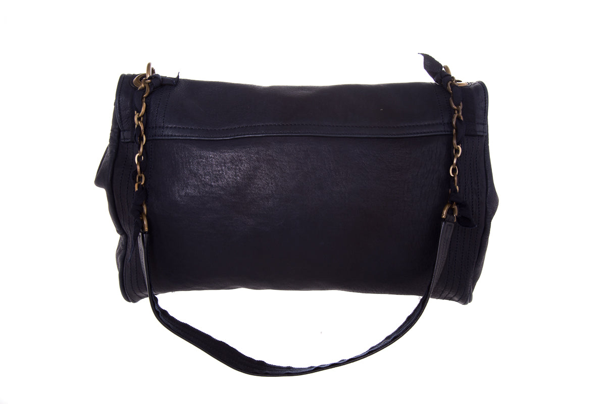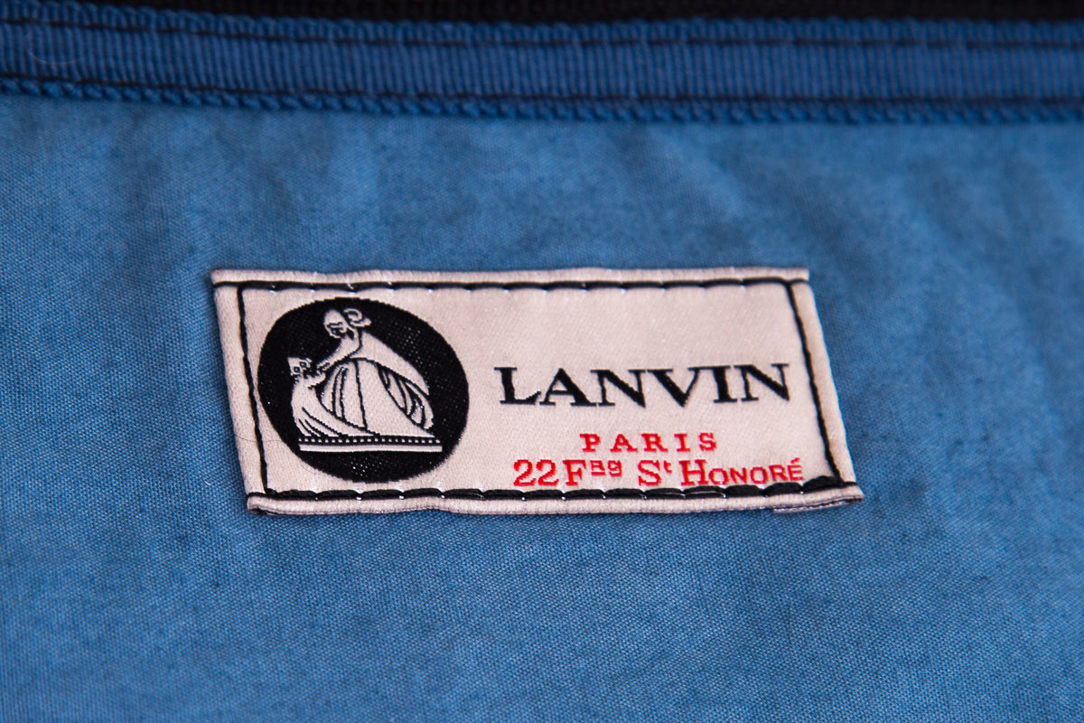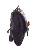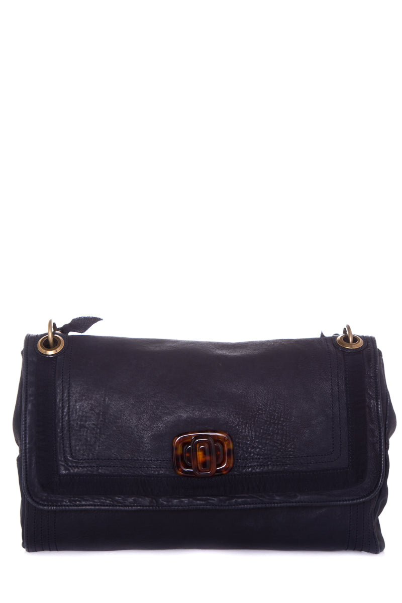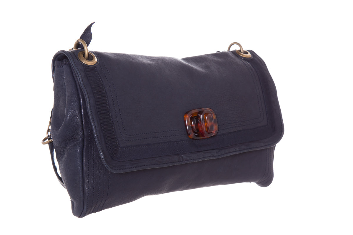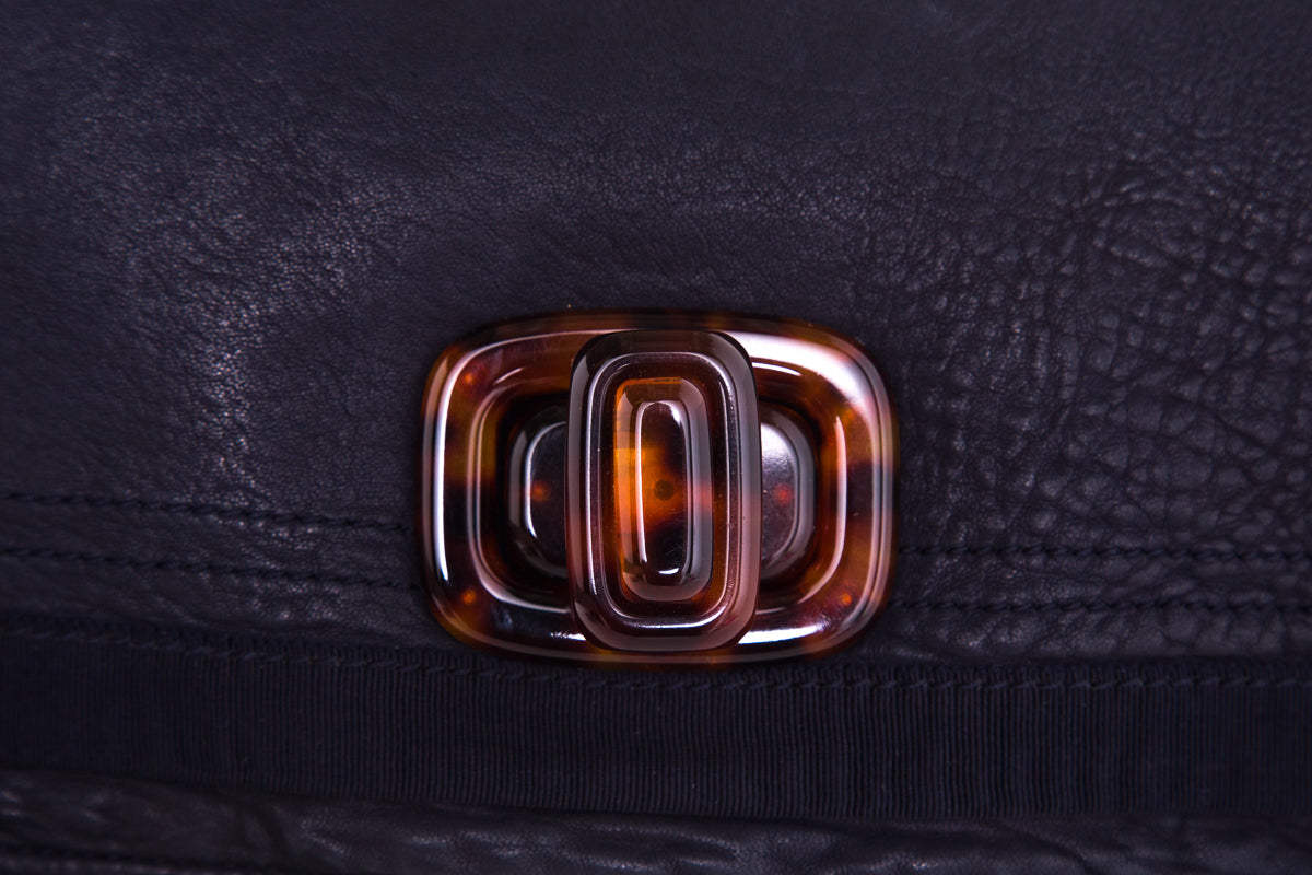 Lanvin Navy Leather Shoulder Bag with tortoise turn lock closure, brushed gold hardware and chain link and ribbon detailed strap. This item is in good condition.