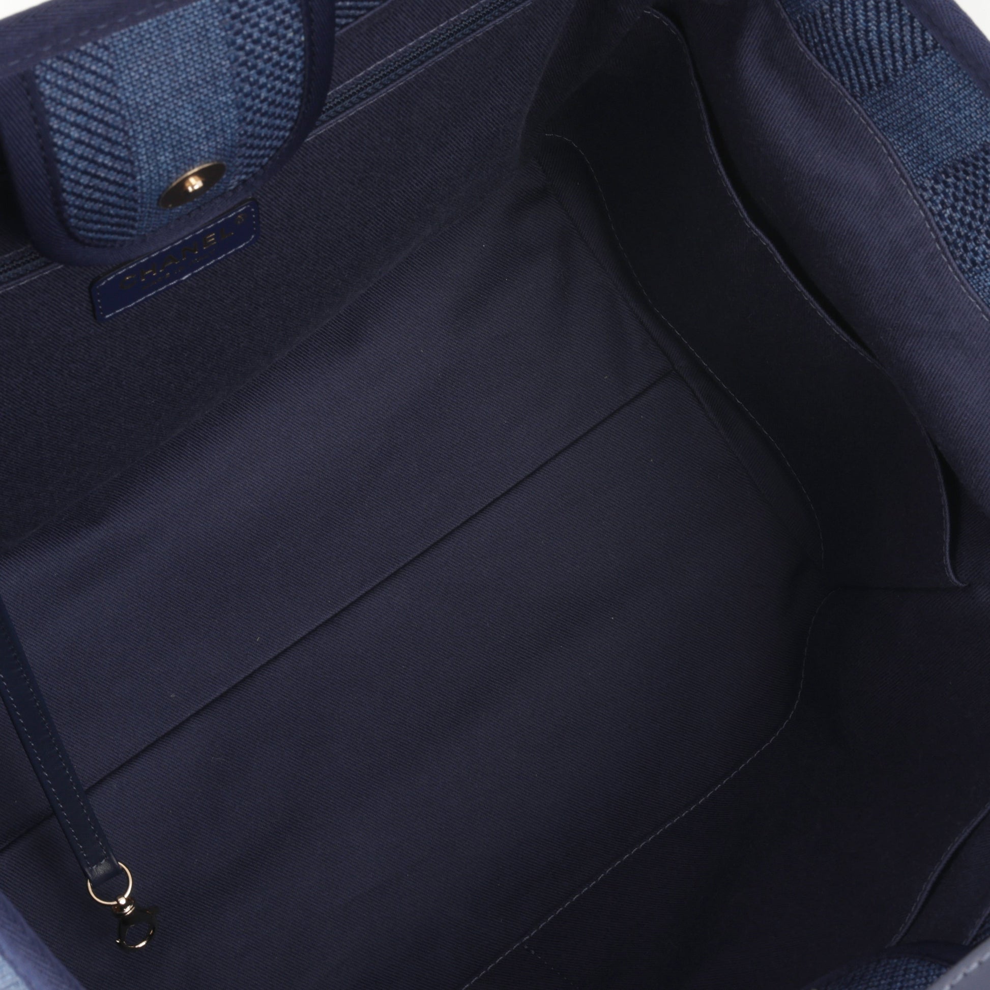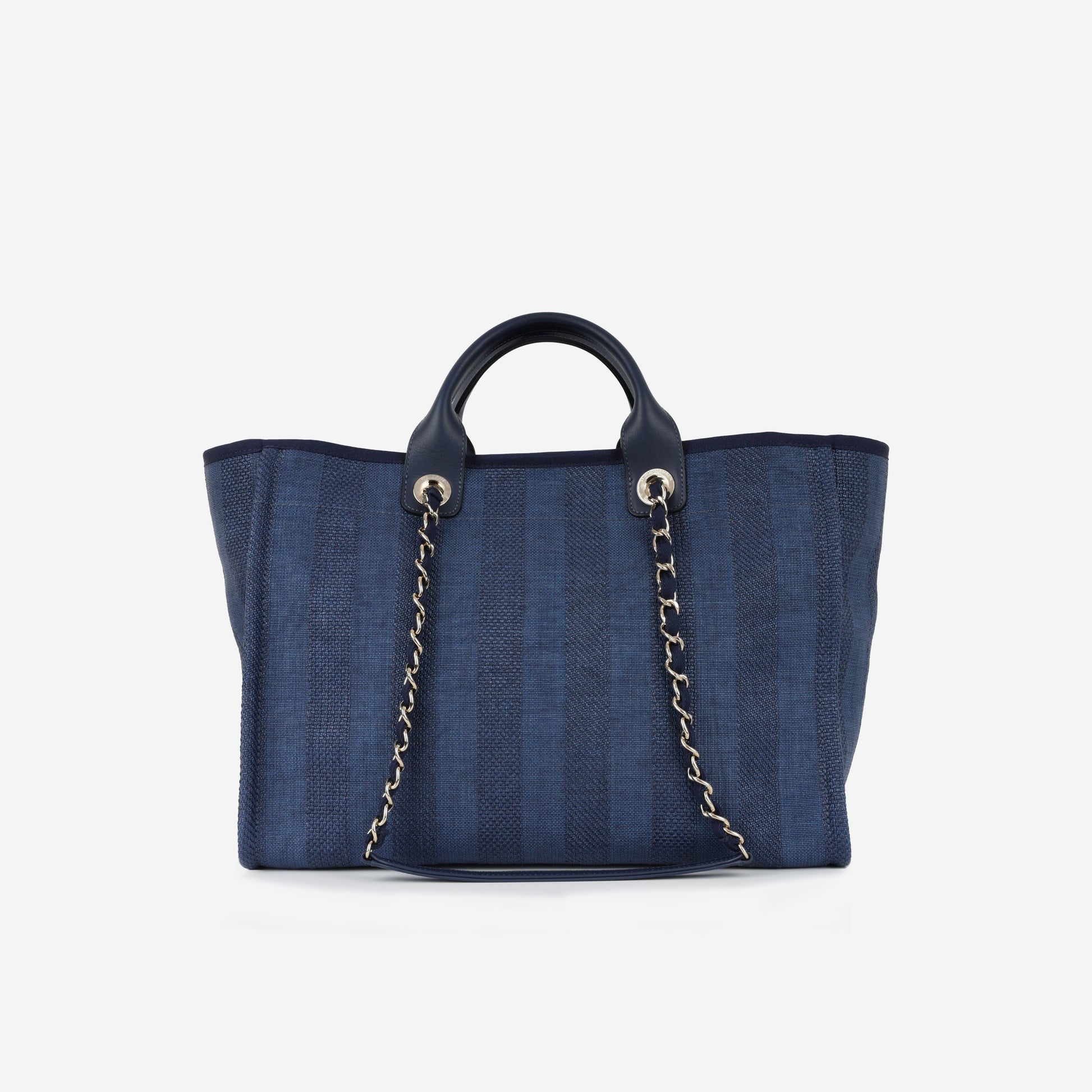 Carefully crafted from mixed striped blue raffia with navy leather trims, the Chanel Deauville handbag is beyond stunning. It's spacious enough to hold everything you would need throughout the day, the Deauville is suitable for travelling, a day at the beach or just running errands.