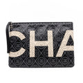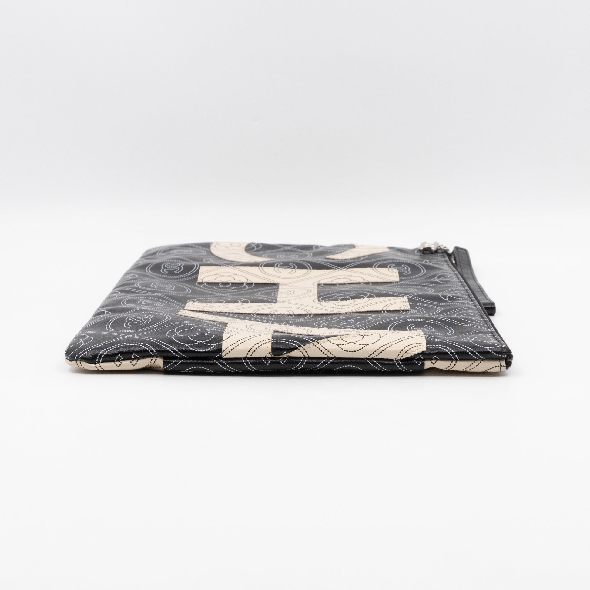 This stunning Chanel Large O-Pouch is a water proof and stylish accessory, features chic diamond printed pattern with CC's and camellia flowers throughout. This particular bag has a white motif on one side and black on the opposite side, creating a timeless yet contemporary look. This pouch comes with a leather wrist strap, can be used as a clutch and convenient daily accessory, it fits your phone, wallet, passport and many other small items. Retail price is $1200.