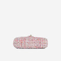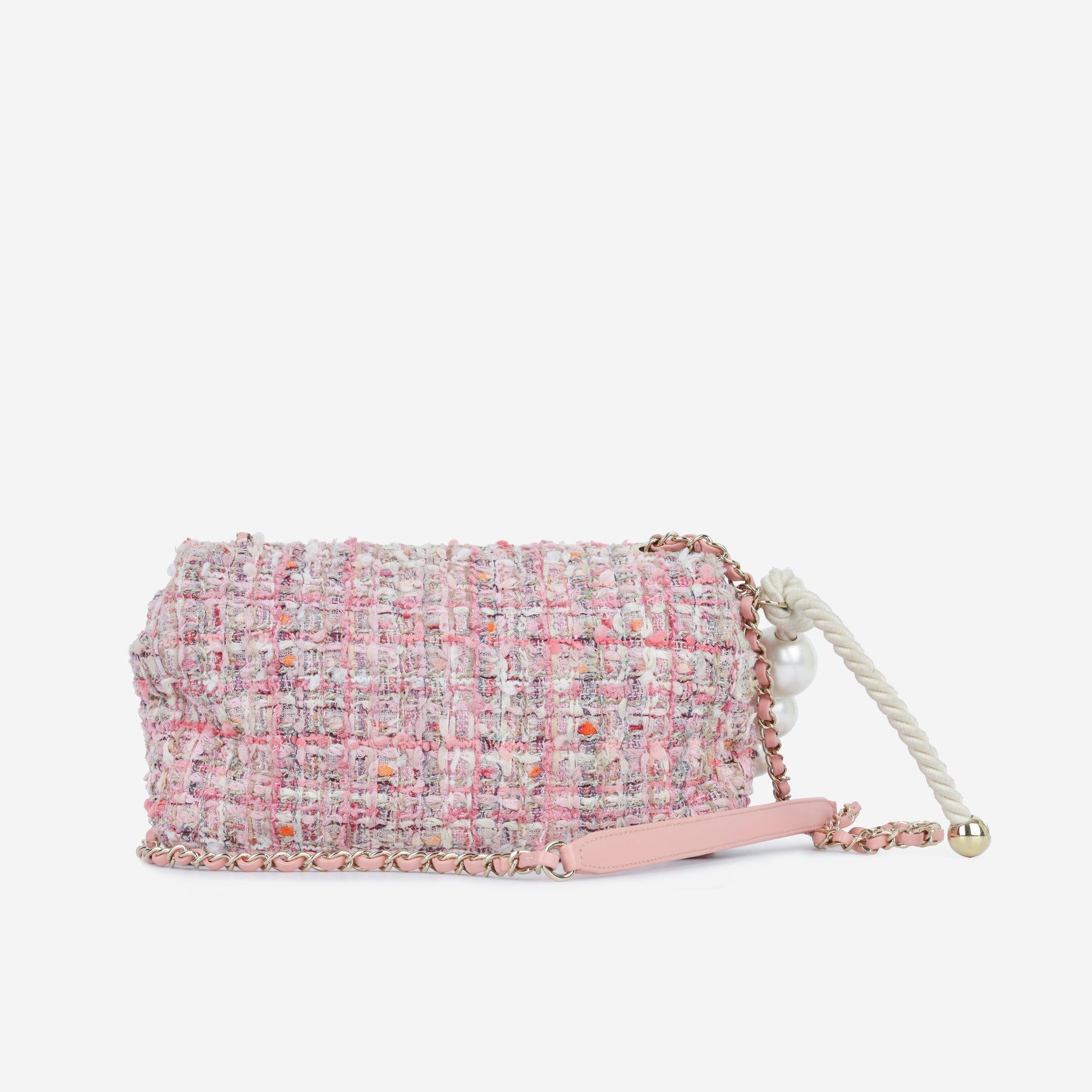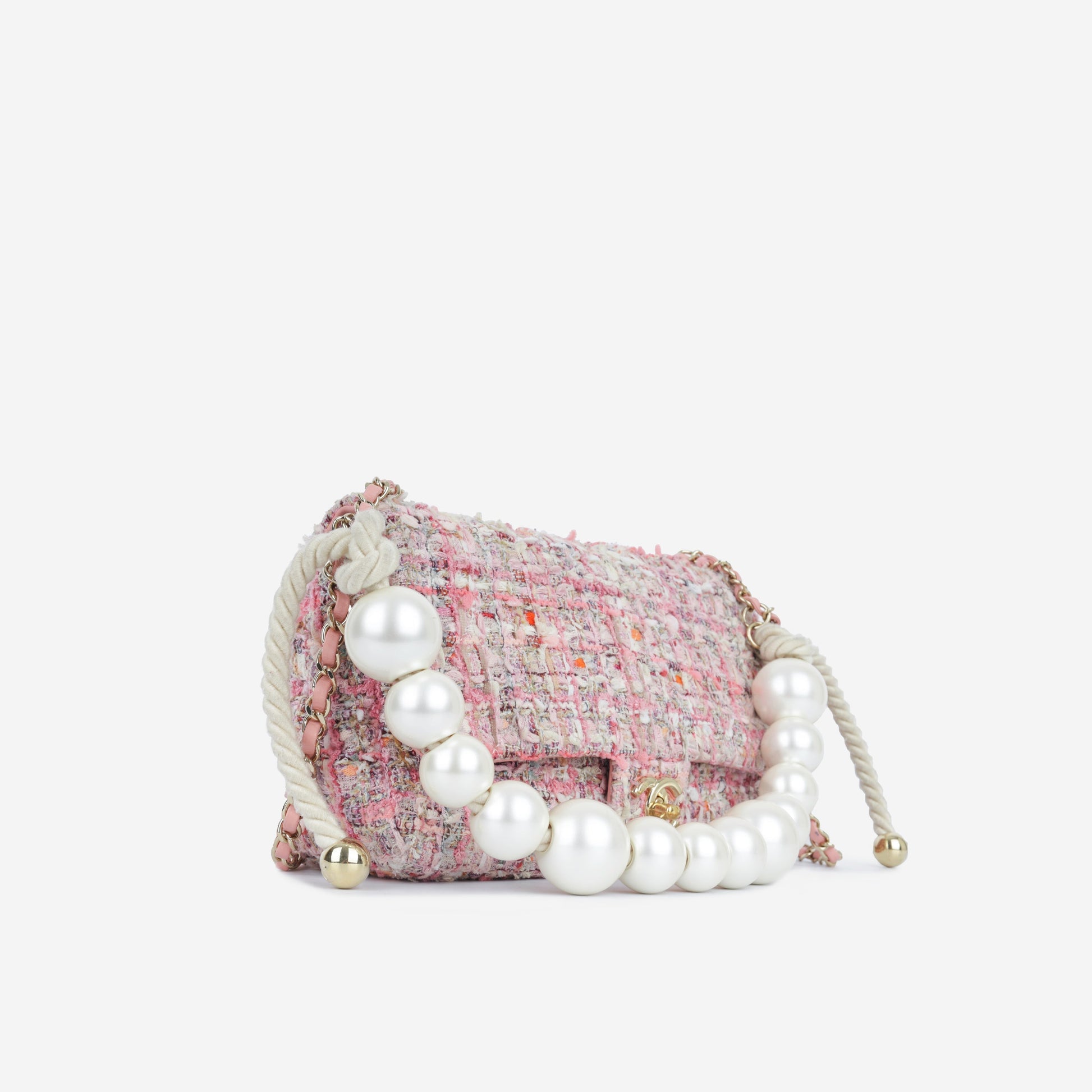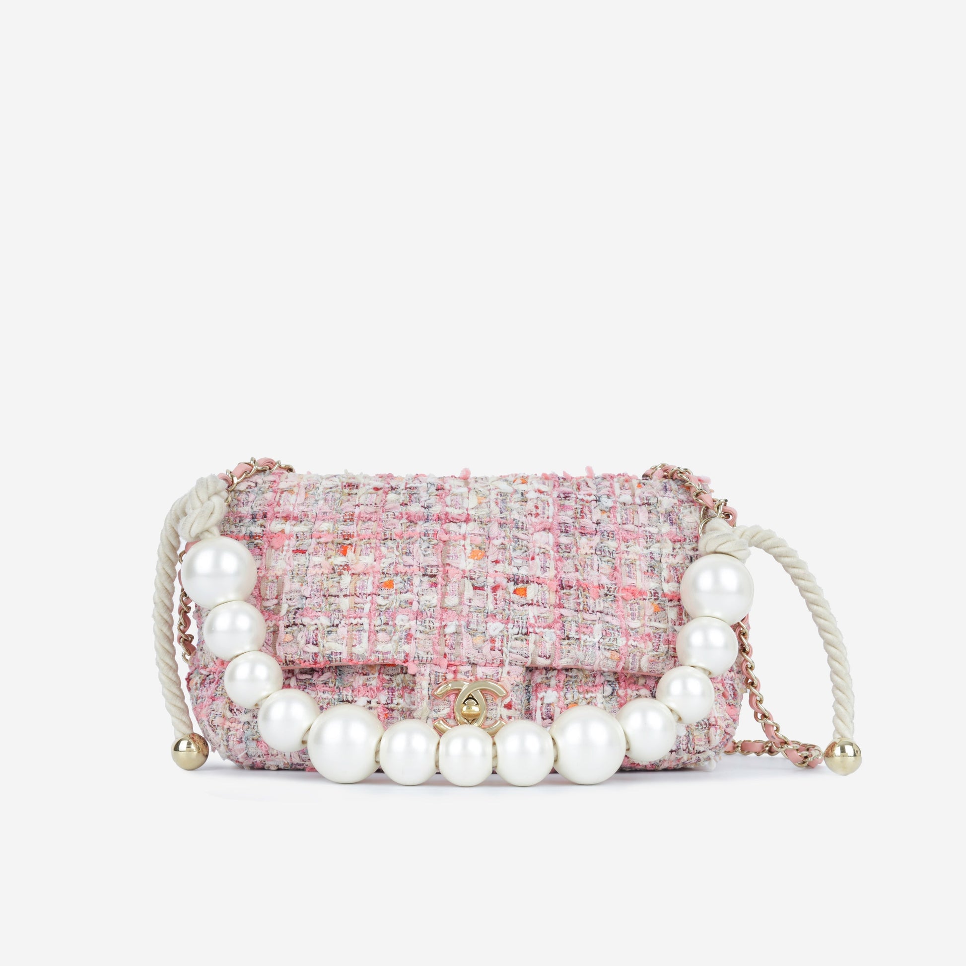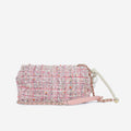 Introducing the Pink Tweed Chanel Bag from the Spring/Summer 2019 runway. Crafted from beautiful pink tweed, it features a front flap with the iconic CC logo in gold hardware. The standout detail? The oversized pearl handle, adding a unique touch. A rare find for Chanel lovers, perfect for any season.