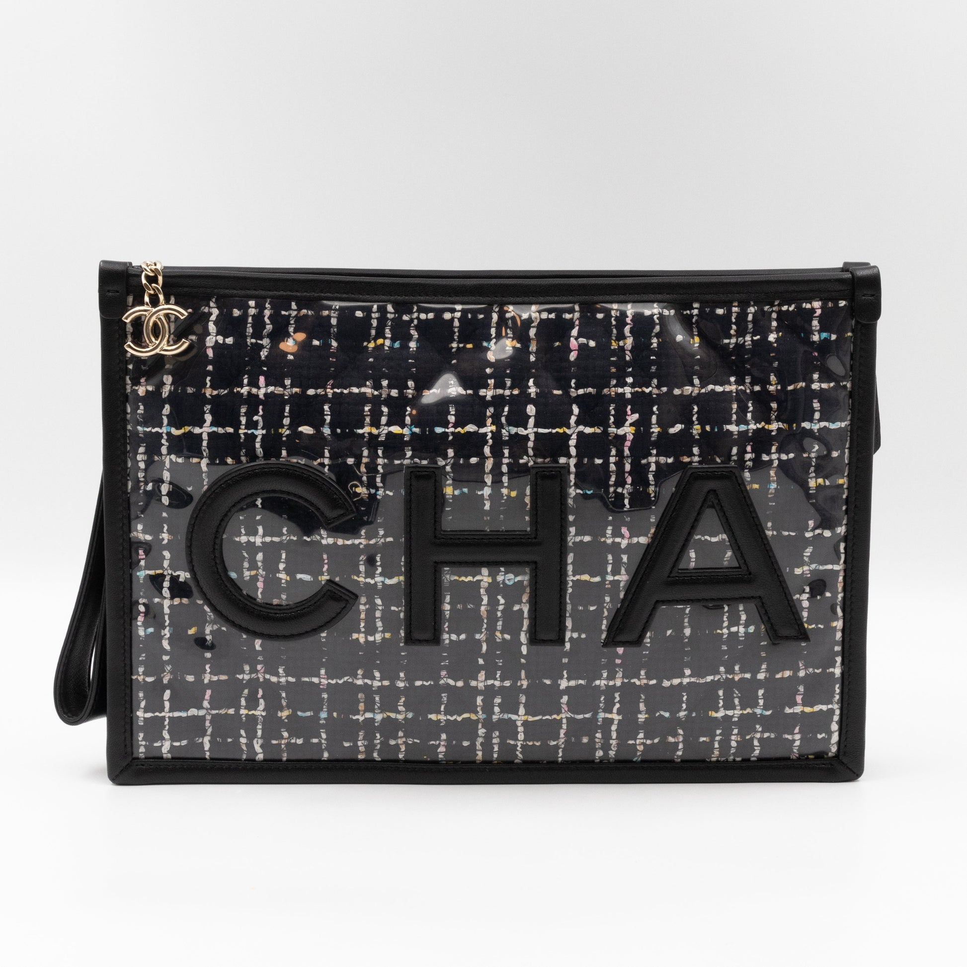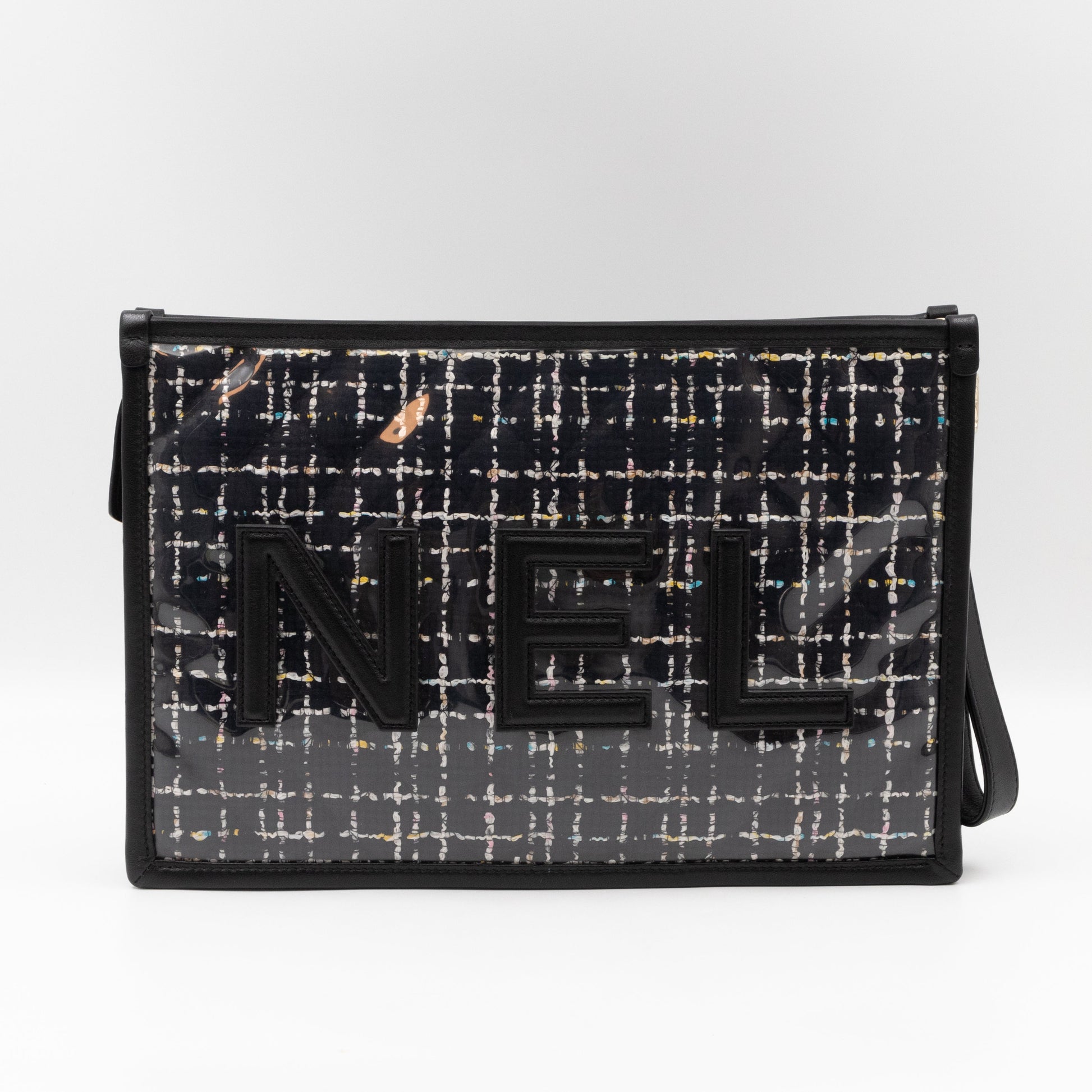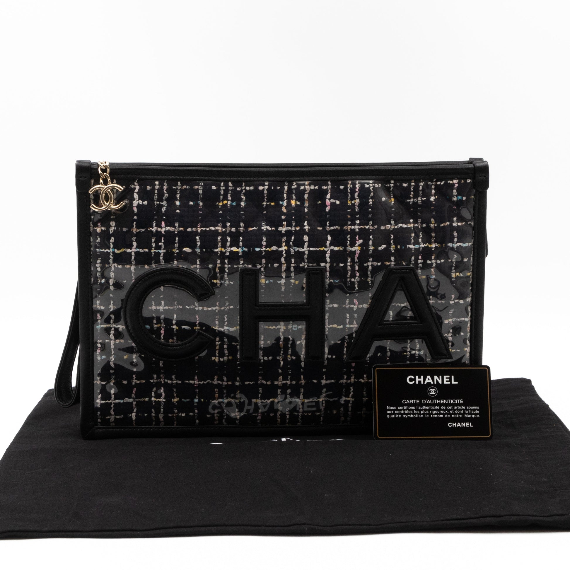 A beautiful Chanel Large Pouch Tweed PVC. Made in black diamond quilted tweed and PVC canvas with silver-tone hardware. it has a "Chanel" logo on both side. Opens to matching black canvas interior. It has a wrist strap for easy carrying. This pouch can be used as a clutch and convenient daily accessory, it fits your phone, wallet, passport and many other small items. The retail price is €1390.