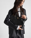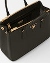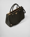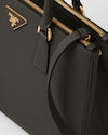 Production of the Prada Galleria bag, composed of 83 pieces, is an fusion between industrial precision and the refined accuracy of craftsmanship that can only be performed by hand. The design is clean and elegant yet innately pragmatic, an aesthetic language blending form and function that combines history and modernity. Originating the definition of "timeless", the Galleria bag has become a hallmark of Prada's identity in the twenty-first century. The accessory, presented in the large version, is made of iconic Saffiano, a calf leather patented by Mario Prada that is resistant to scratches and water and defined by its crosshatch texture.