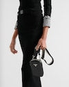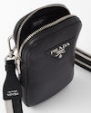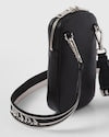 This leather mini-bag is decorated with a detachable, adjustable embroidered shoulder strap. The accessory with metal hardware is completed by the metal lettering logo on the front.