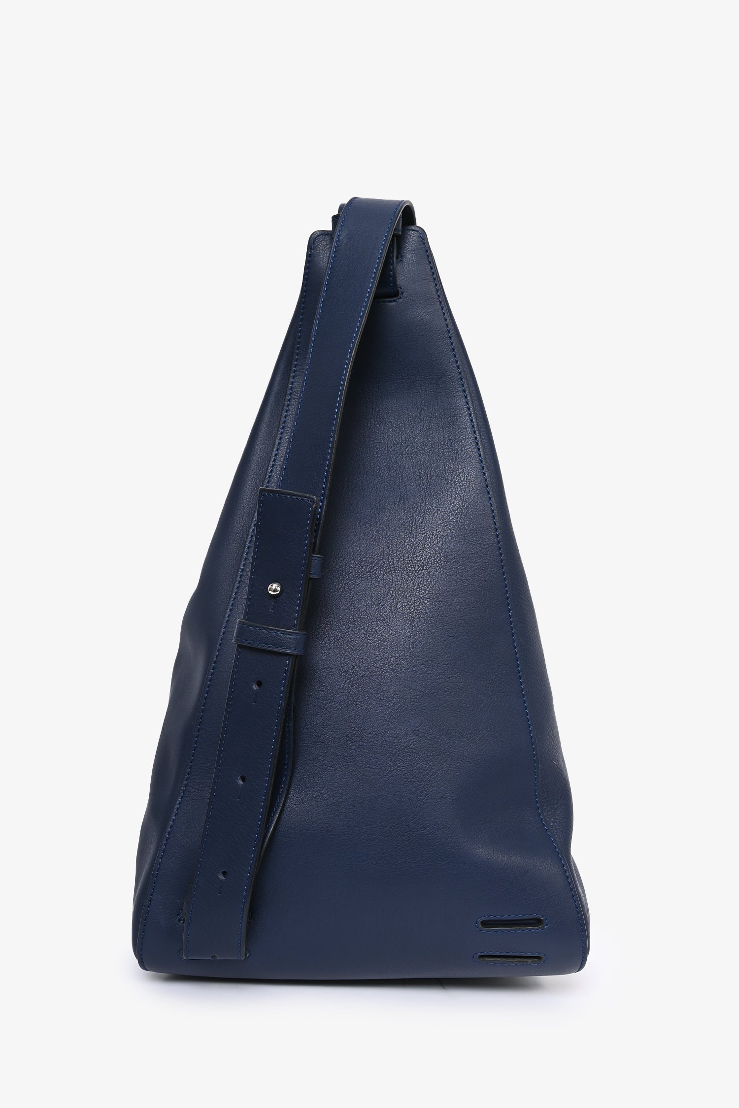 Loewe Navy Leather Anton Sling Bag. Single exterior zip pocket. Top zip closure. Tonal interior. Single interior wall flap with fold-over flap with snap-button closure. Adjustable strap. Silver-tone hardware.