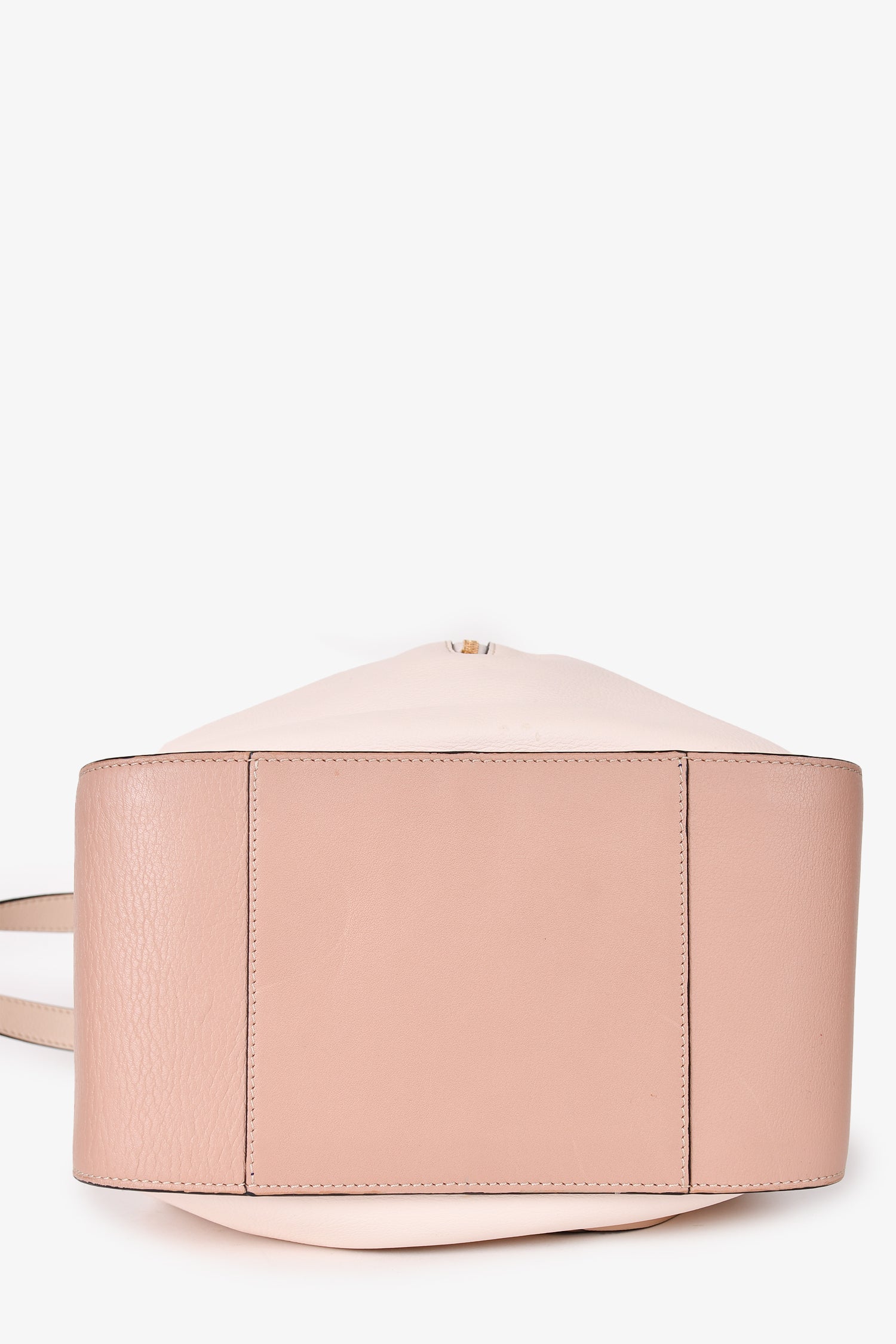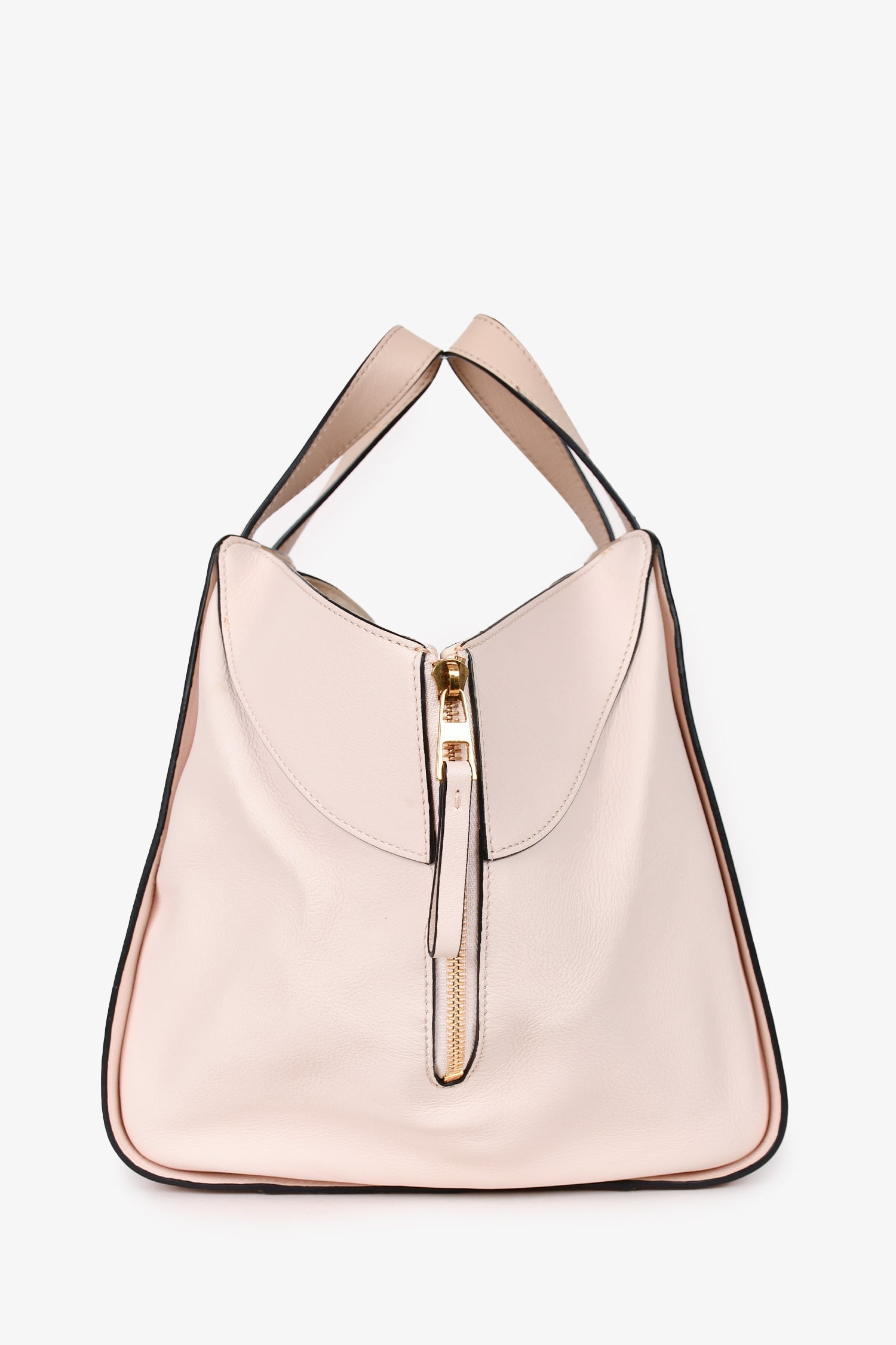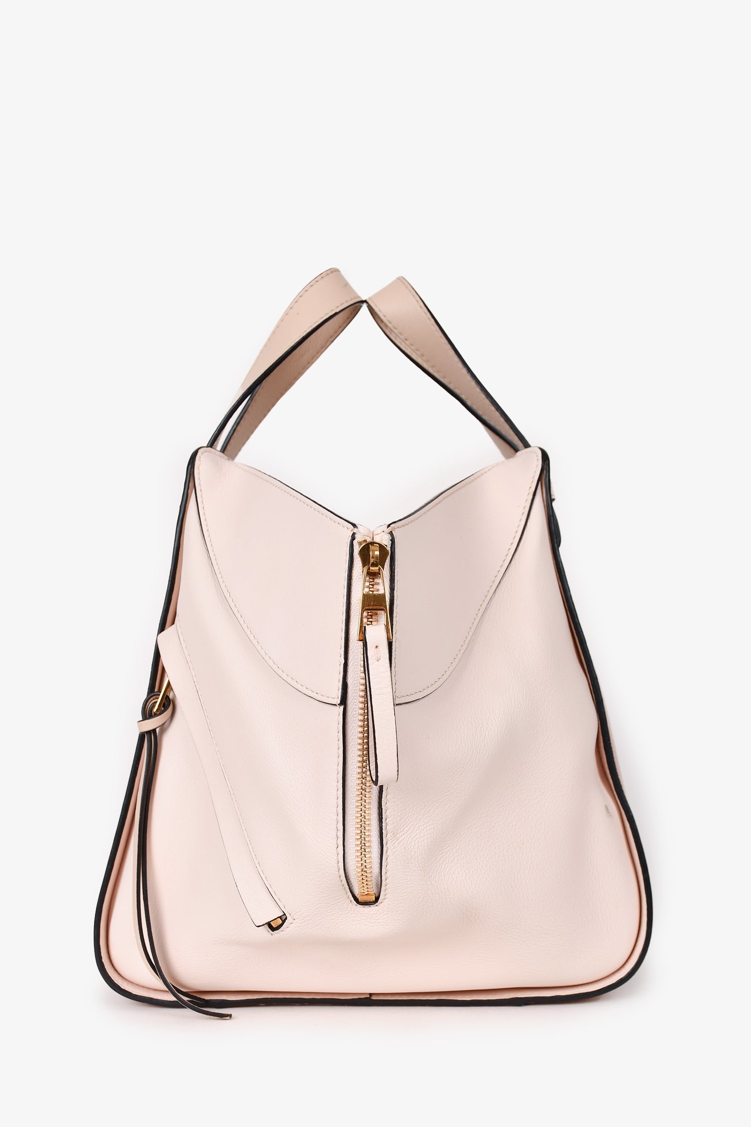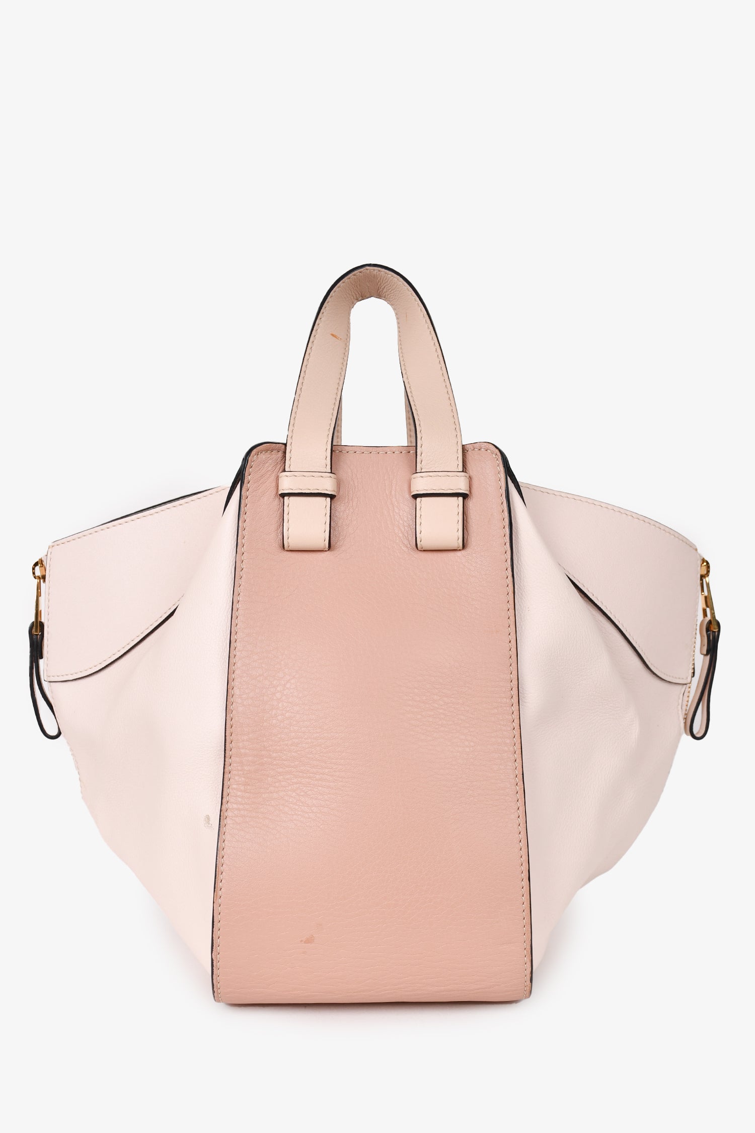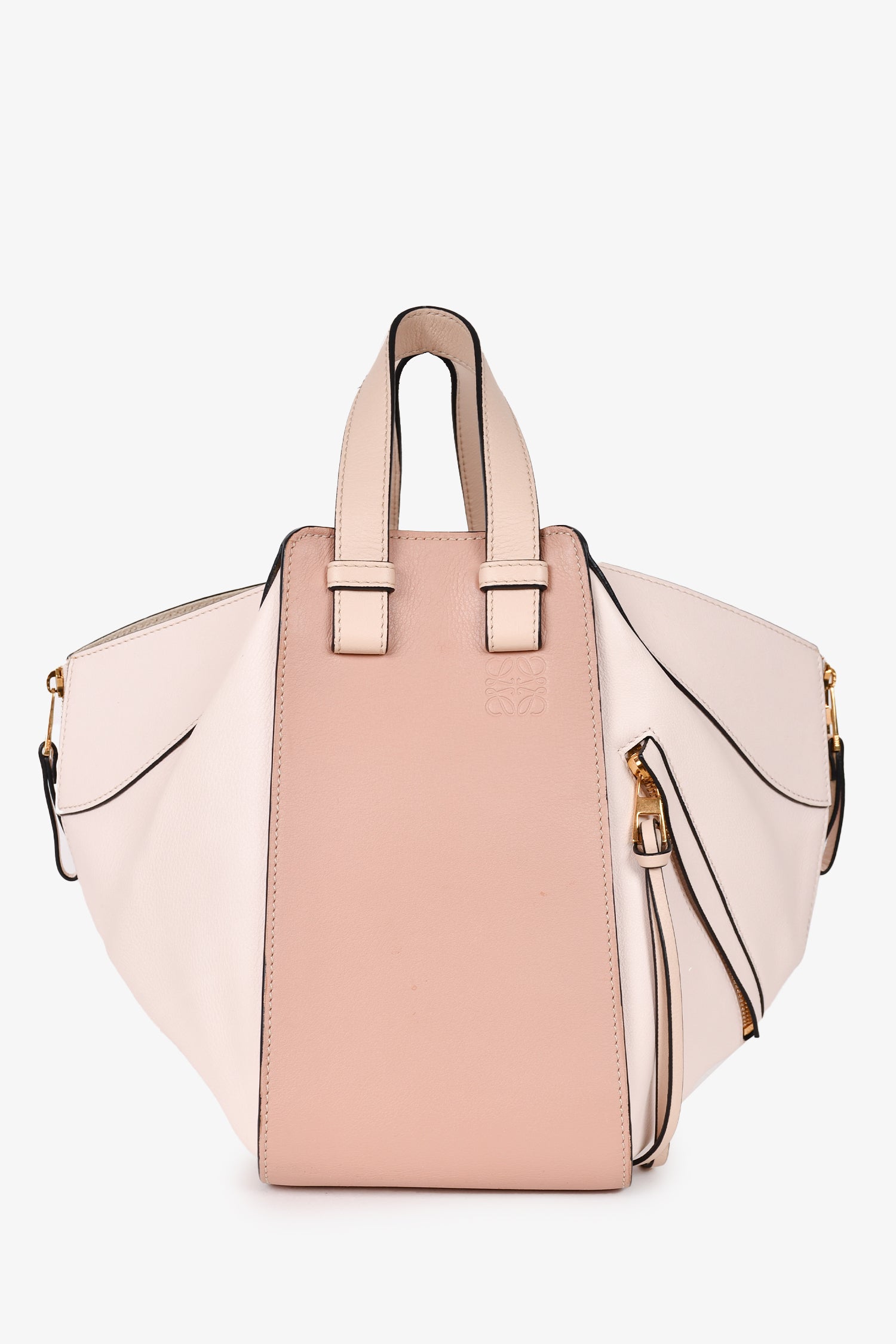 Loewe Pink Leather Small Hammock Tote with Strap. Tonal stitching. Leather trimming. Flat top handles. Canvas lined interior. Hook closure in interior. Dual interior pockets. 3 zippered compartments with leather pull tabs.