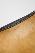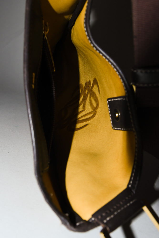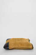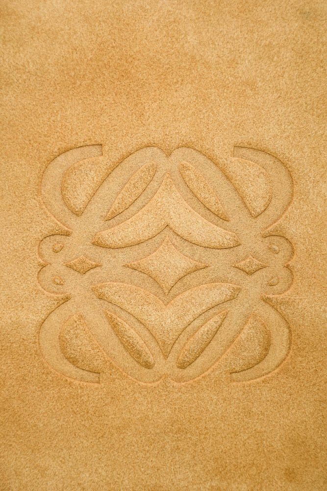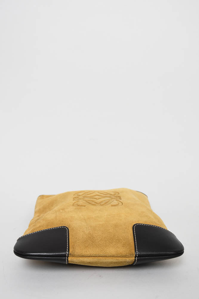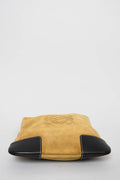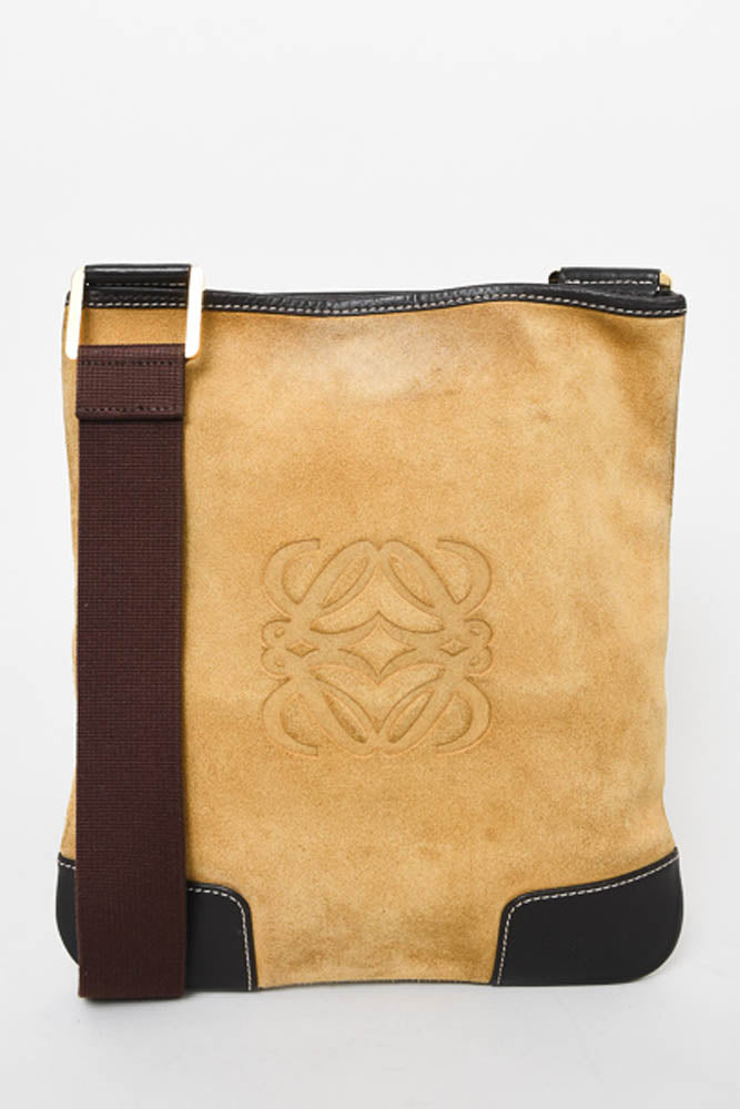Loewe Tan Suede Satchel Crossbody Bag. Interior magnetic button closure. Interior wall flap with zip closure. Adjustable strap. Gold-tone hardware. Contrast and tonal stitching.