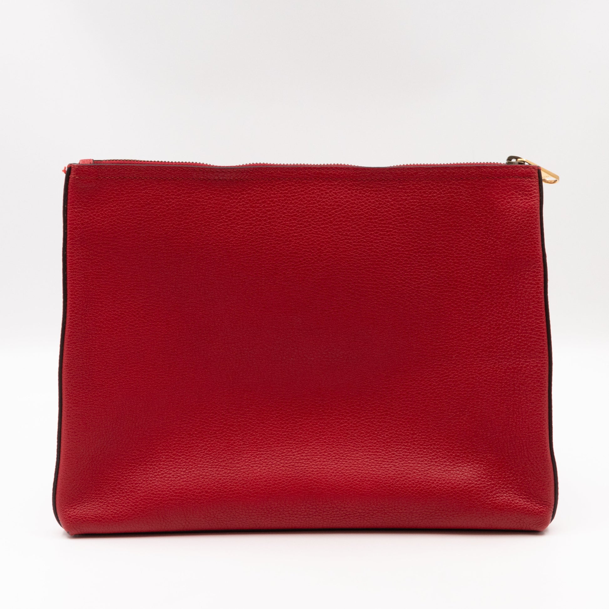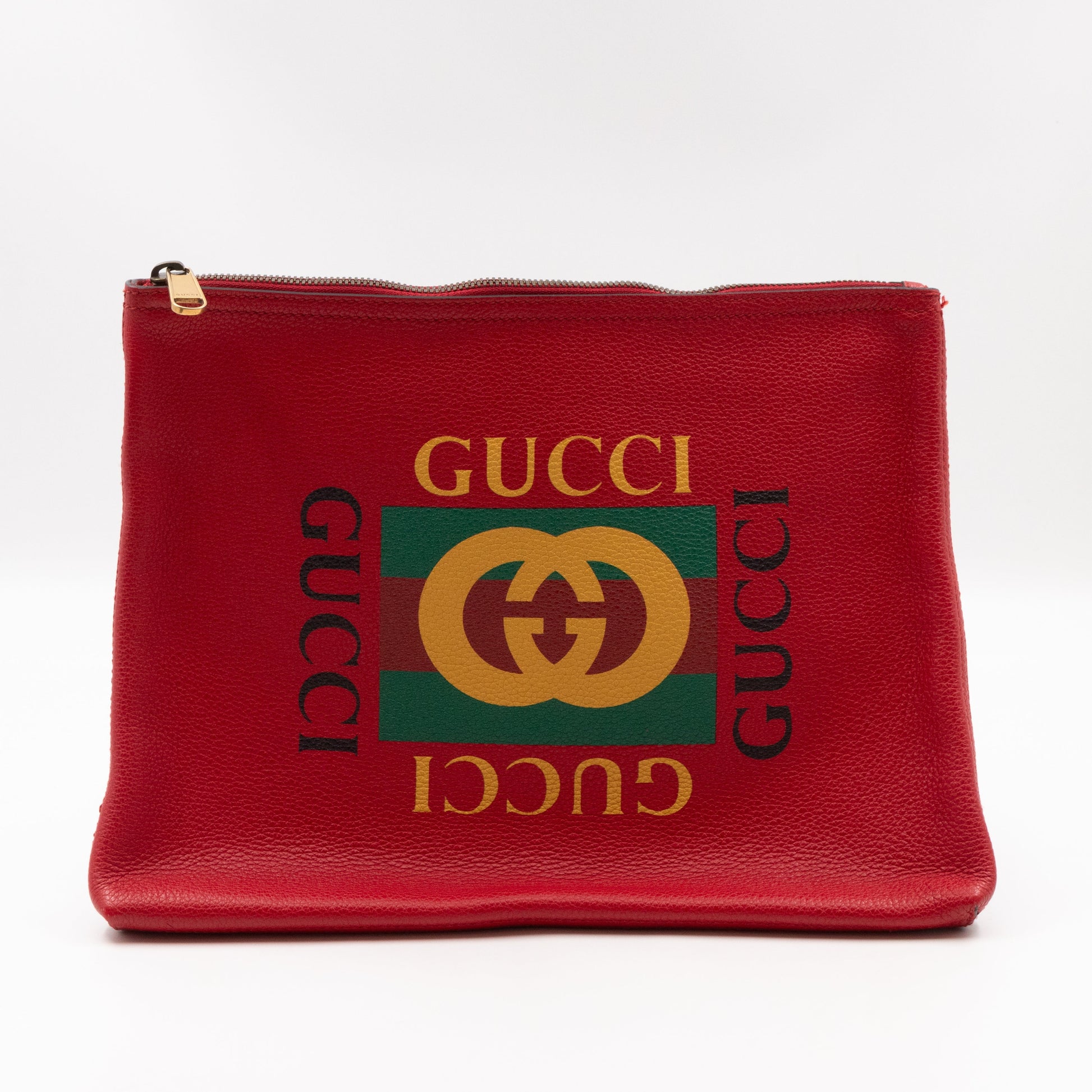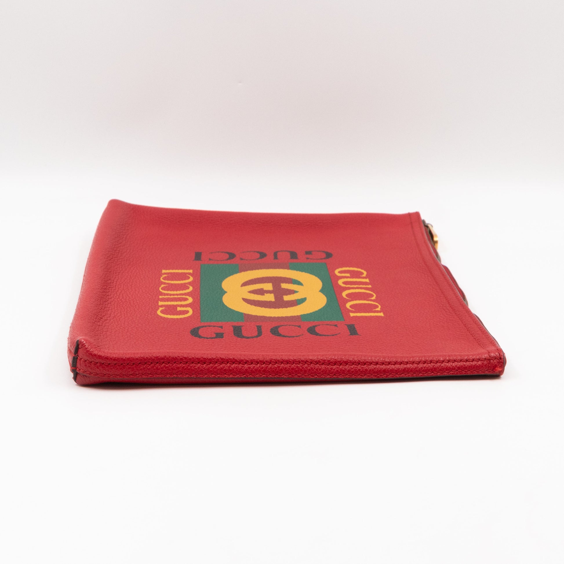 This is a classic Gucci Logo Portfolio Pouch Bag. It features chic red leather printed with the vintage Gucci emblems. Opens to spacious space made of red suede. Simple and useful for everyday use. Nice choice use as a make up bag or a modern clutch. Retail price is $750.