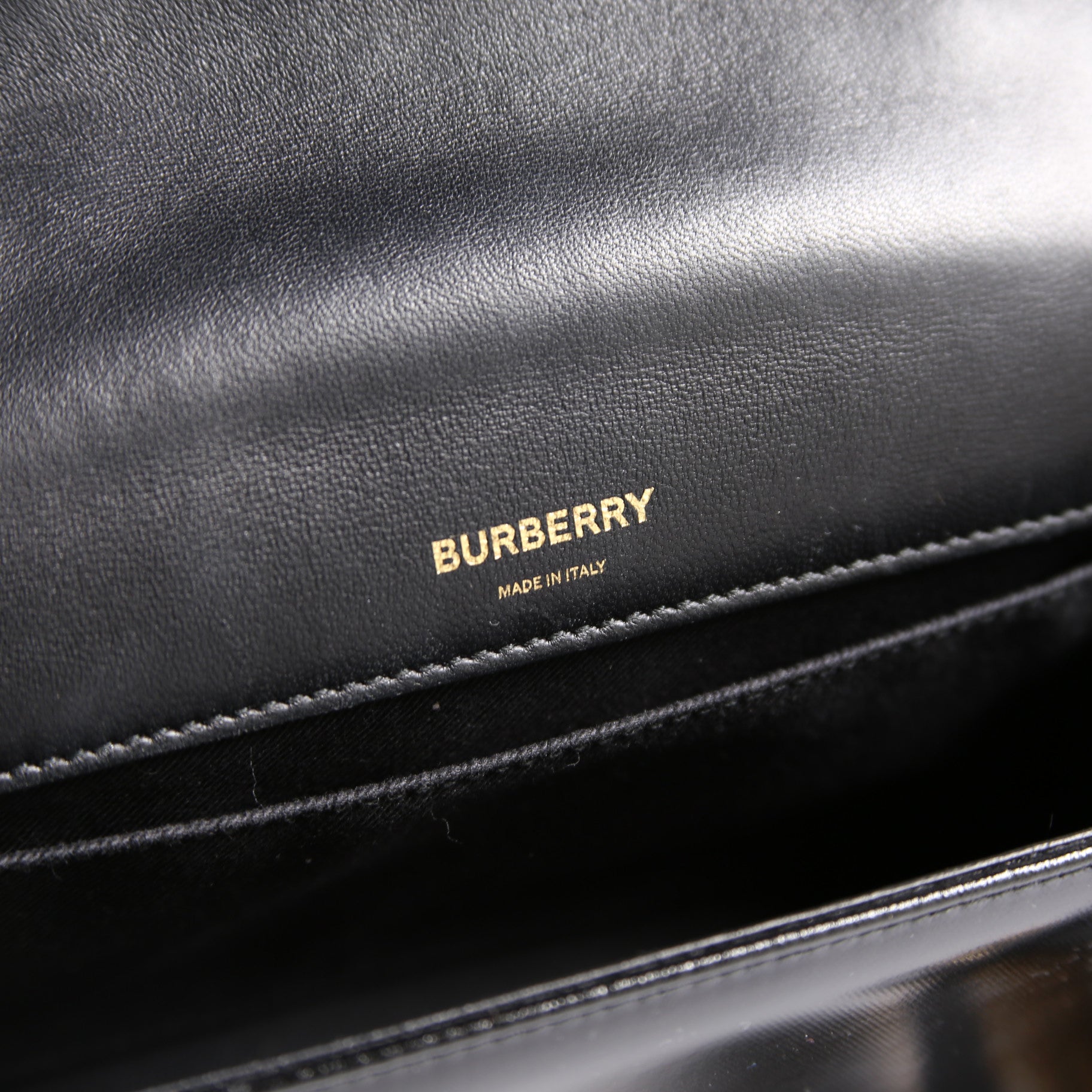 Interior: The interior shows light wear under the flap. The interior features one open pocket.