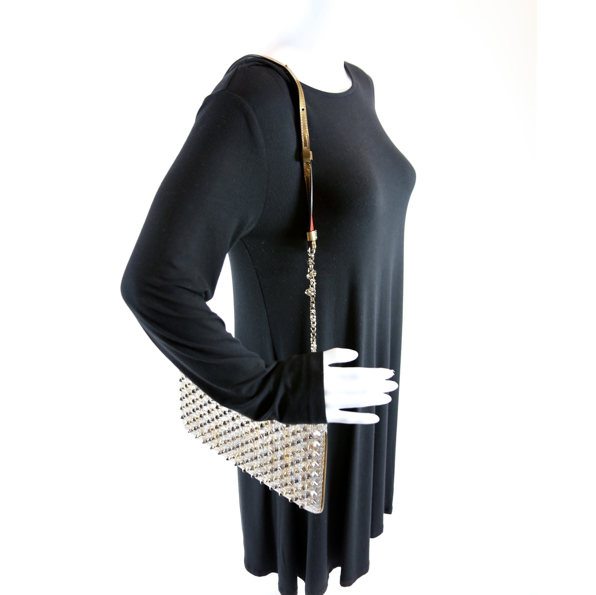 This Christian Louboutin Loubiposh Spike Metallic Raffia Clutchis eye catching bag.