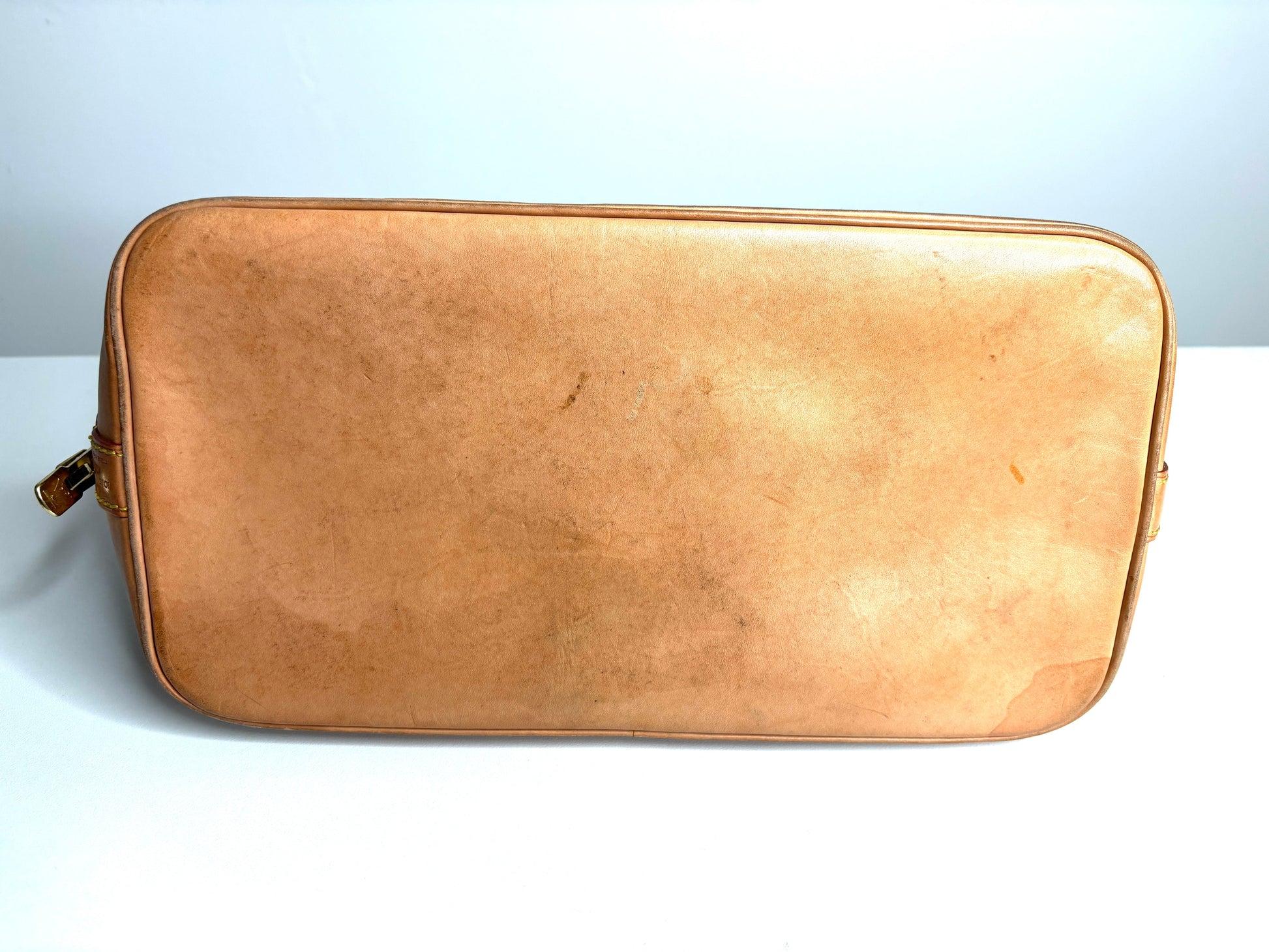 - Condition: good , stains on the bottom, water marks and staining around the base, darkening to the handles. Slight indentation on one side (just from the way the handle falls) only noticeable on up-close inspection. There are no rips or cracks in the canvas and the interior is clean