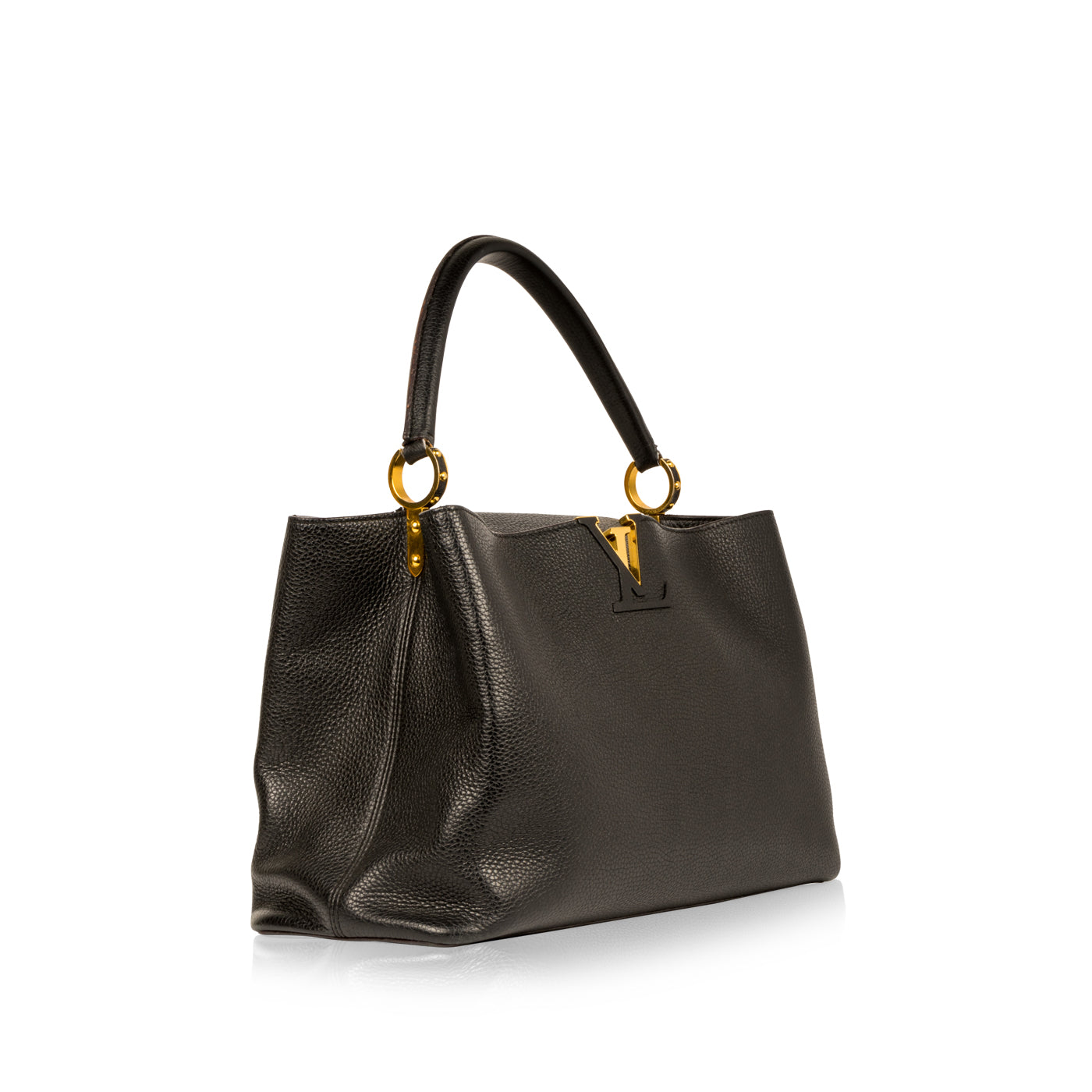This stunning Capucines GM presented by Louis Vuitton is a bag that every chic, sophisticated woman should have in their wardrobe. Carefully crafted from black textured leather with the brand's signature "LV" logo plaque, the Capucines is luxurious and timeless. The perfect bag to keep you sleek and stylish, this piece is the perfect compliment to any smart or casual look. Exuding modern chicness but balanced with an effortlessly elegant aesthetic, the Capucines is the ideal investment for any woman with a love for luxury. You can easily carry your laptop, iPad, binders and papers comfortably inside while remaining the boss business woman you are. A classic piece that will stay in style and in your wardrobe forever, the Capucines is a well-worthy addition to any luxury handbag collection.
